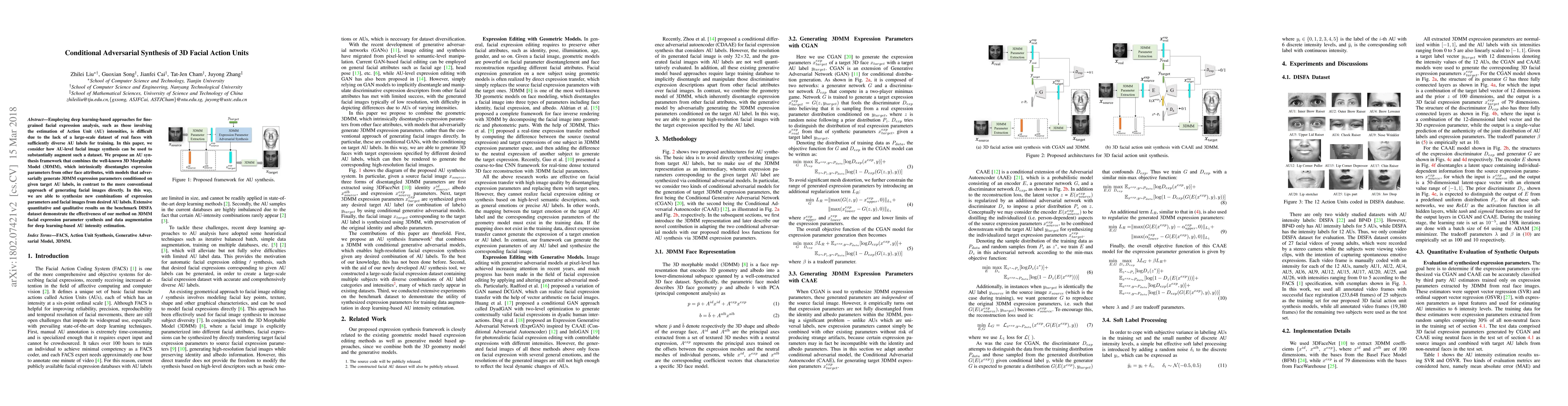 This paper proposes a deep learning-based framework for synthesizing 3D facial action units (AU) using a combination of 3D Morphable Model (3DMM) and adversarial models to generate expression parameters conditioned on AU labels, thereby augmenting datasets for AU intensity estimation. The method is shown to effectively synthesize new AU combinations and improve AU intensity estimation on the DISFA dataset.