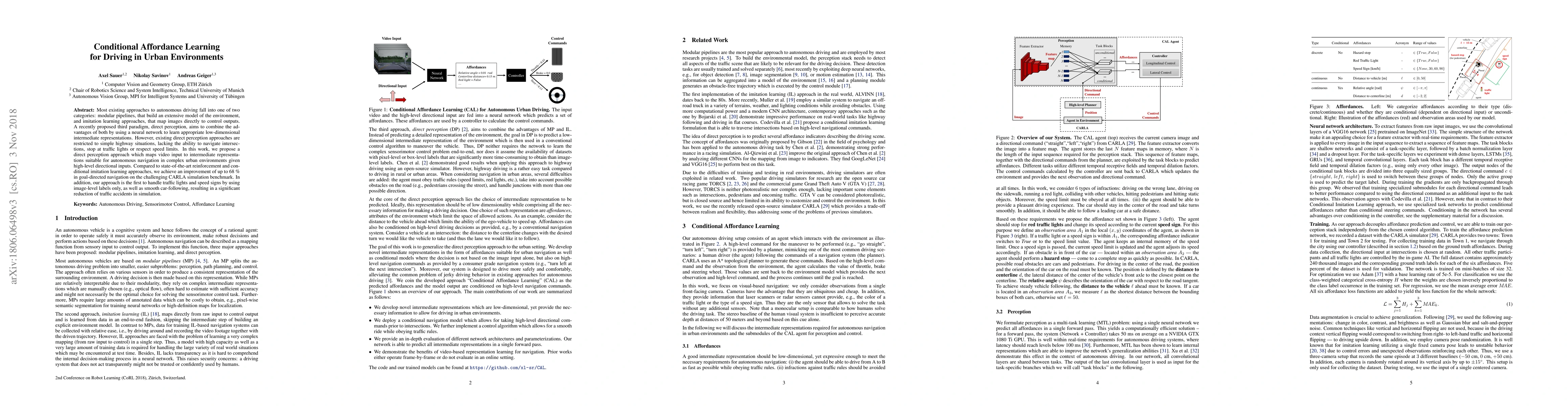 Most existing approaches to autonomous driving fall into one of two categories: modular pipelines, that build an extensive model of the environment, and imitation learning approaches, that map images directly to control outputs. A recently proposed third paradigm, direct perception, aims to combine the advantages of both by using a neural network to learn appropriate low-dimensional intermediate representations. However, existing direct perception approaches are restricted to simple highway situations, lacking the ability to navigate intersections, stop at traffic lights or respect speed limits. In this work, we propose a direct perception approach which maps video input to intermediate representations suitable for autonomous navigation in complex urban environments given high-level directional inputs. Compared to state-of-the-art reinforcement and conditional imitation learning approaches, we achieve an improvement of up to 68 % in goal-directed navigation on the challenging CARLA simulation benchmark. In addition, our approach is the first to handle traffic lights and speed signs by using image-level labels only, as well as smooth car-following, resulting in a significant reduction of traffic accidents in simulation.
