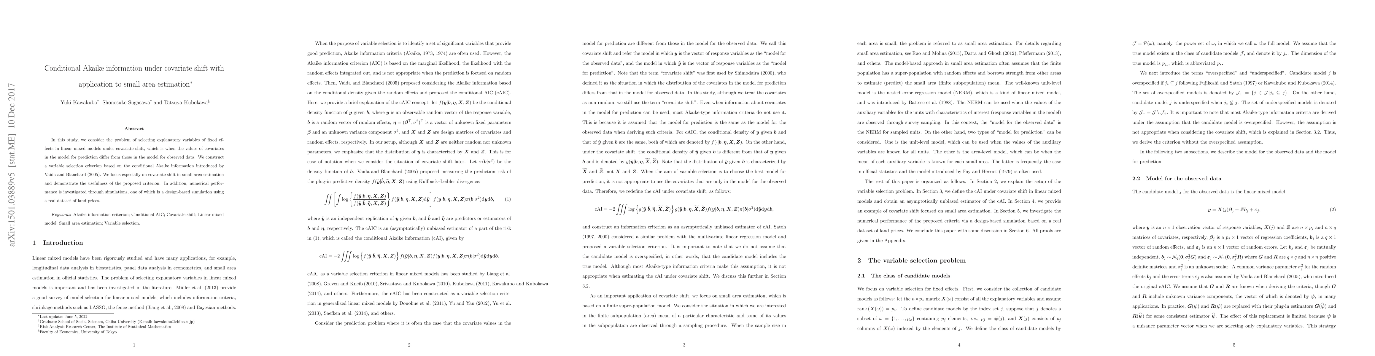 This study develops a variable selection criterion for linear mixed models under covariate shift, utilizing the conditional Akaike information. It specifically applies this method to small area estimation and validates its effectiveness through simulations, including a real-world land price dataset.