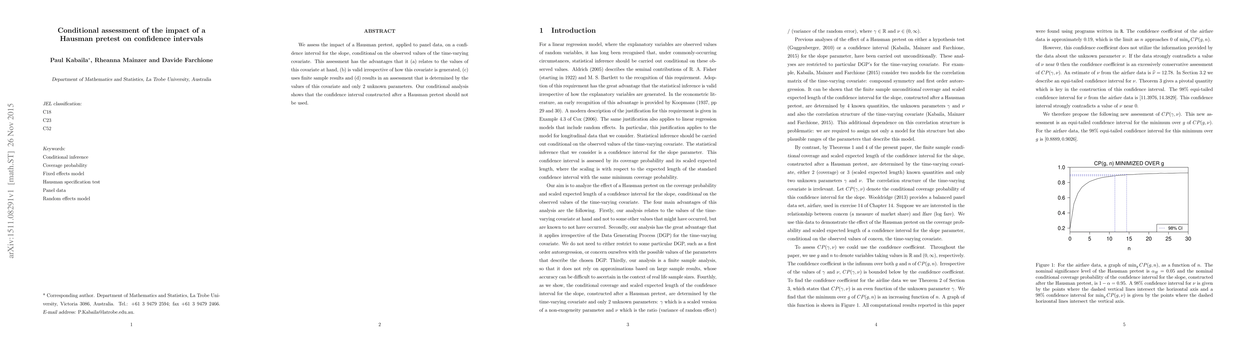 We assess the impact of a Hausman pretest, applied to panel data, on a confidence interval for the slope, conditional on the observed values of the time-varying covariate. This assessment has the advantages that it (a) relates to the values of this covariate at hand, (b) is valid irrespective of how this covariate is generated, (c) uses finite sample results and (d) results in an assessment that is determined by the values of this covariate and only 2 unknown parameters. Our conditional analysis shows that the confidence interval constructed after a Hausman pretest should not be used.