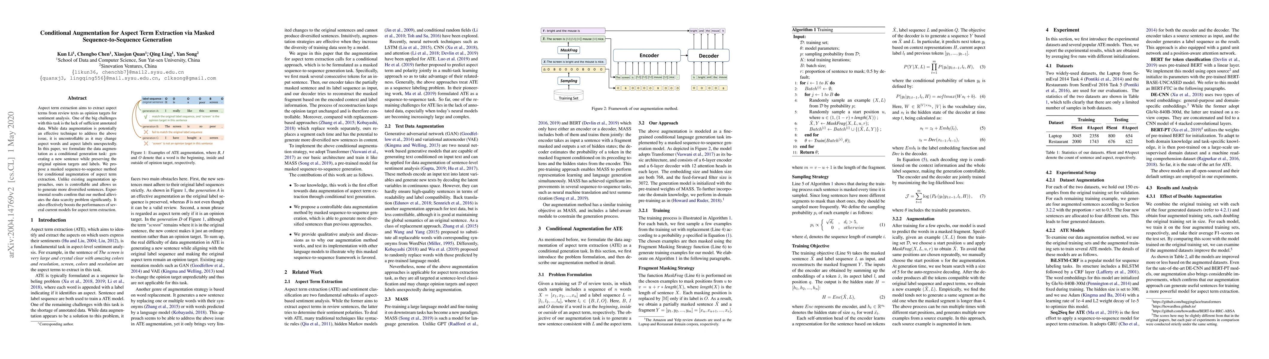 This paper proposes a masked sequence-to-sequence method for conditional augmentation to address the data scarcity issue in aspect term extraction. The approach generates new sentences while preserving original opinion targets and labels, resulting in more diverse and effective augmentation that significantly boosts model performance.