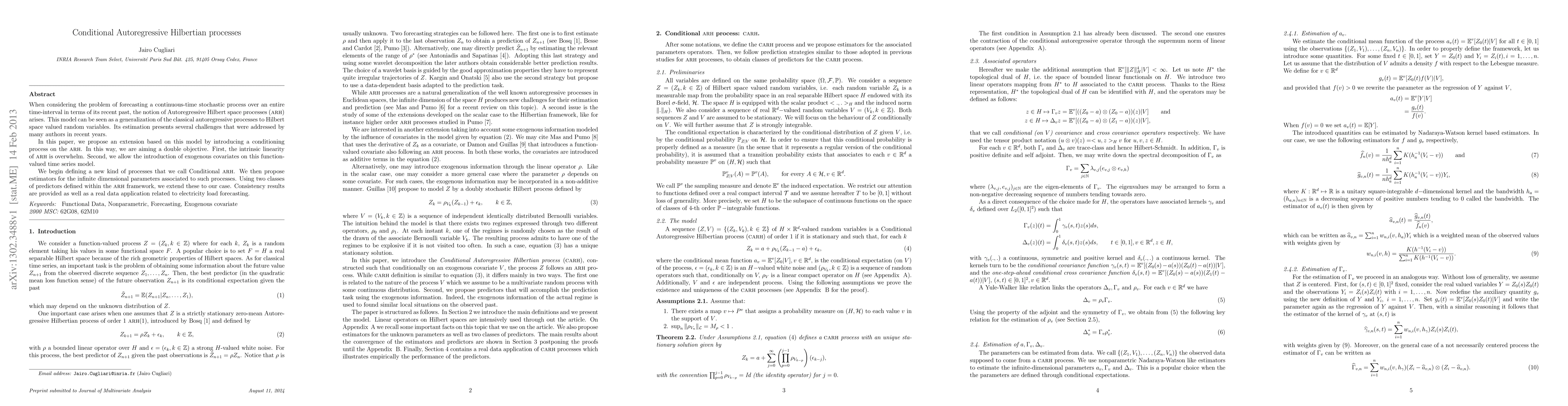 This paper introduces Conditional Autoregressive Hilbertian processes (CARH), extending Autoregressive Hilbert space processes (ARH) by incorporating a conditioning process. The study aims to overcome the intrinsic linearity of ARH and integrate exogenous covariates, proposing estimators for infinite dimensional parameters and demonstrating its application in electricity load forecasting.
