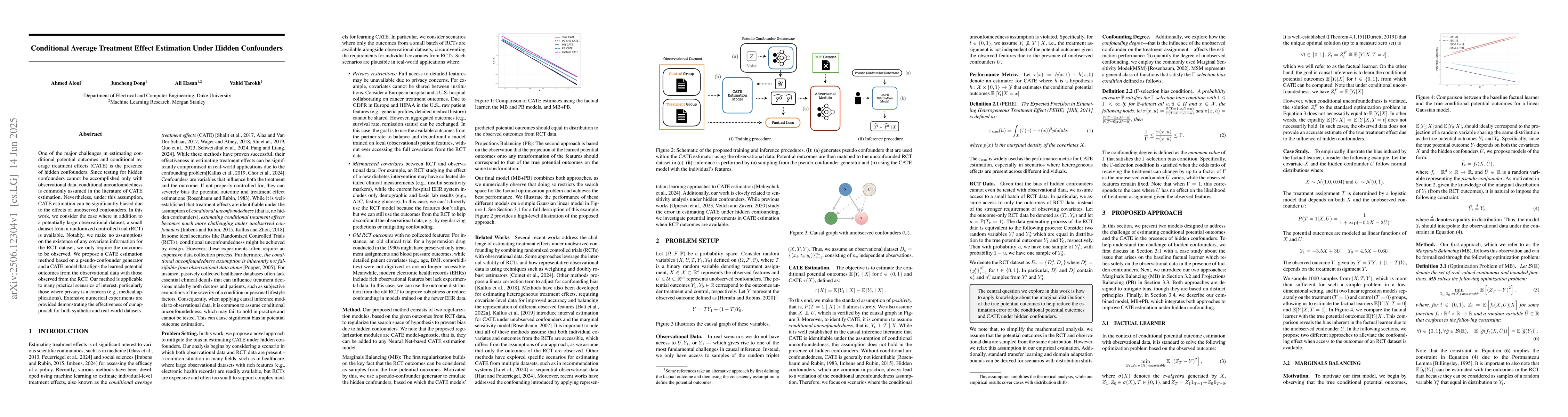One of the major challenges in estimating conditional potential outcomes and conditional average treatment effects (CATE) is the presence of hidden confounders. Since testing for hidden confounders cannot be accomplished only with observational data, conditional unconfoundedness is commonly assumed in the literature of CATE estimation. Nevertheless, under this assumption, CATE estimation can be significantly biased due to the effects of unobserved confounders. In this work, we consider the case where in addition to a potentially large observational dataset, a small dataset from a randomized controlled trial (RCT) is available. Notably, we make no assumptions on the existence of any covariate information for the RCT dataset, we only require the outcomes to be observed. We propose a CATE estimation method based on a pseudo-confounder generator and a CATE model that aligns the learned potential outcomes from the observational data with those observed from the RCT. Our method is applicable to many practical scenarios of interest, particularly those where privacy is a concern (e.g., medical applications). Extensive numerical experiments are provided demonstrating the effectiveness of our approach for both synthetic and real-world datasets.