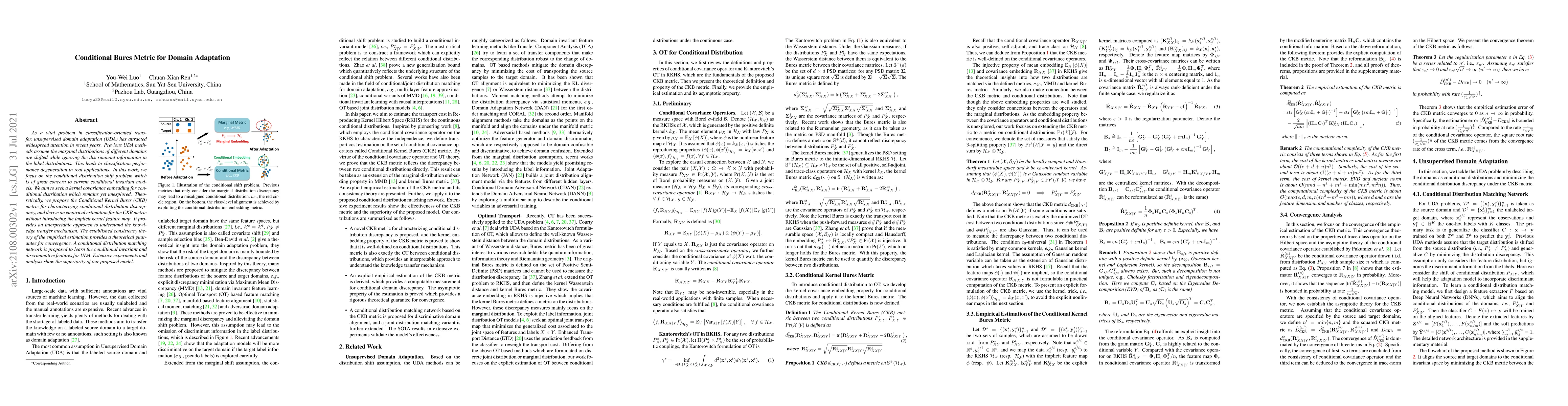 As a vital problem in classification-oriented transfer, unsupervised domain adaptation (UDA) has attracted widespread attention in recent years. Previous UDA methods assume the marginal distributions of different domains are shifted while ignoring the discriminant information in the label distributions. This leads to classification performance degeneration in real applications. In this work, we focus on the conditional distribution shift problem which is of great concern to current conditional invariant models. We aim to seek a kernel covariance embedding for conditional distribution which remains yet unexplored. Theoretically, we propose the Conditional Kernel Bures (CKB) metric for characterizing conditional distribution discrepancy, and derive an empirical estimation for the CKB metric without introducing the implicit kernel feature map. It provides an interpretable approach to understand the knowledge transfer mechanism. The established consistency theory of the empirical estimation provides a theoretical guarantee for convergence. A conditional distribution matching network is proposed to learn the conditional invariant and discriminative features for UDA. Extensive experiments and analysis show the superiority of our proposed model.