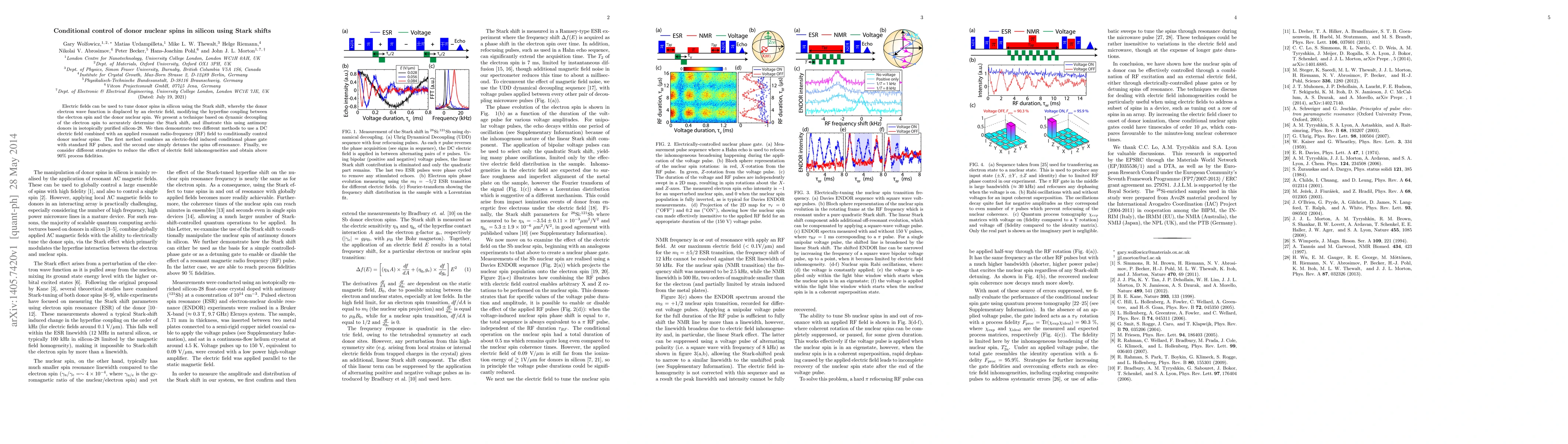This paper presents a method for controlling donor nuclear spins in silicon via Stark shifts, utilizing electric fields to modify hyperfine coupling. It demonstrates two techniques for conditional control of antimony donor nuclear spins, achieving high process fidelities despite field inhomogeneities.