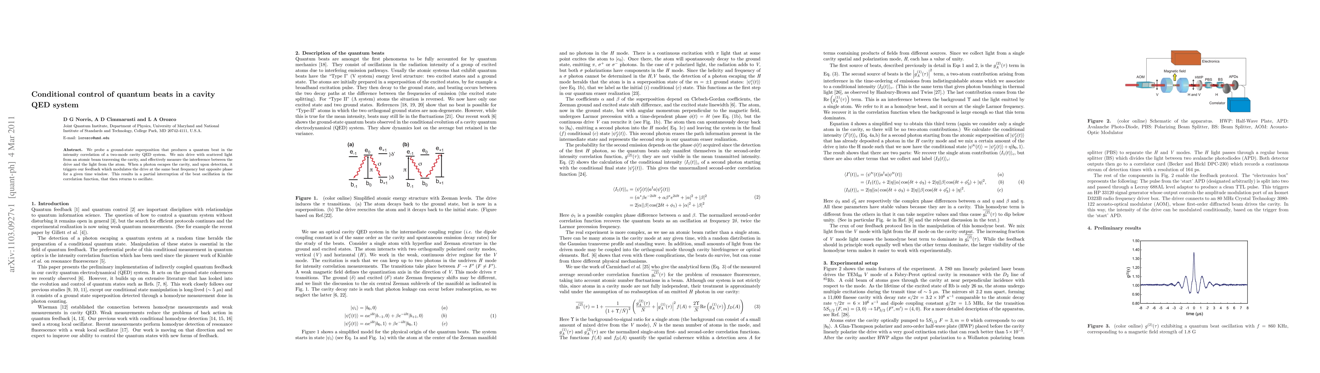 The paper explores the conditional control of quantum beats in a cavity QED system by measuring interference from an atomic beam, and using photon detection to trigger feedback that temporarily disrupts the beat oscillation, which then resumes.