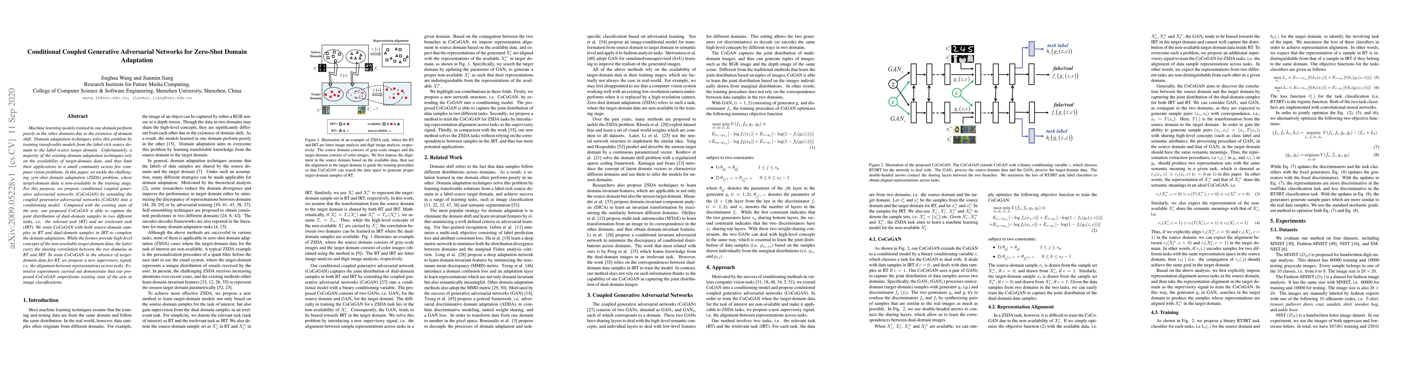 This paper proposes conditional coupled generative adversarial networks (CoCoGAN) to tackle zero-shot domain adaptation, where target-domain data is unavailable during training. CoCoGAN leverages a supervisory signal based on alignment between representations across relevant and irrelevant tasks to achieve domain adaptation without target-domain data.