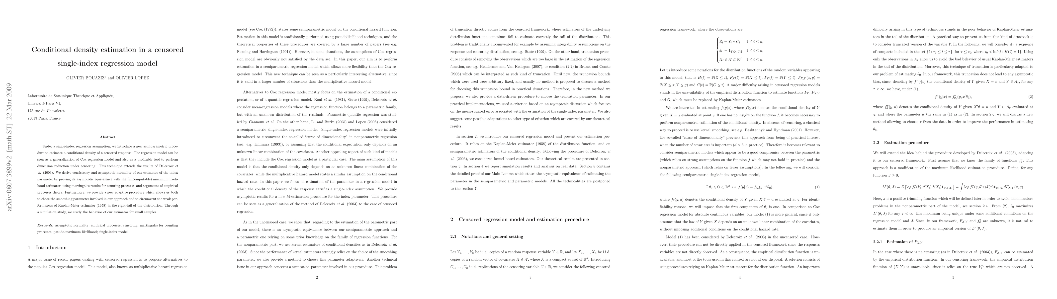 This paper introduces a semiparametric method for estimating conditional densities in a censored single-index regression model, extending previous work. The proposed estimator demonstrates consistency and asymptotic normality, and a new adaptive procedure improves performance, especially in the right-tail, validated through simulation studies.