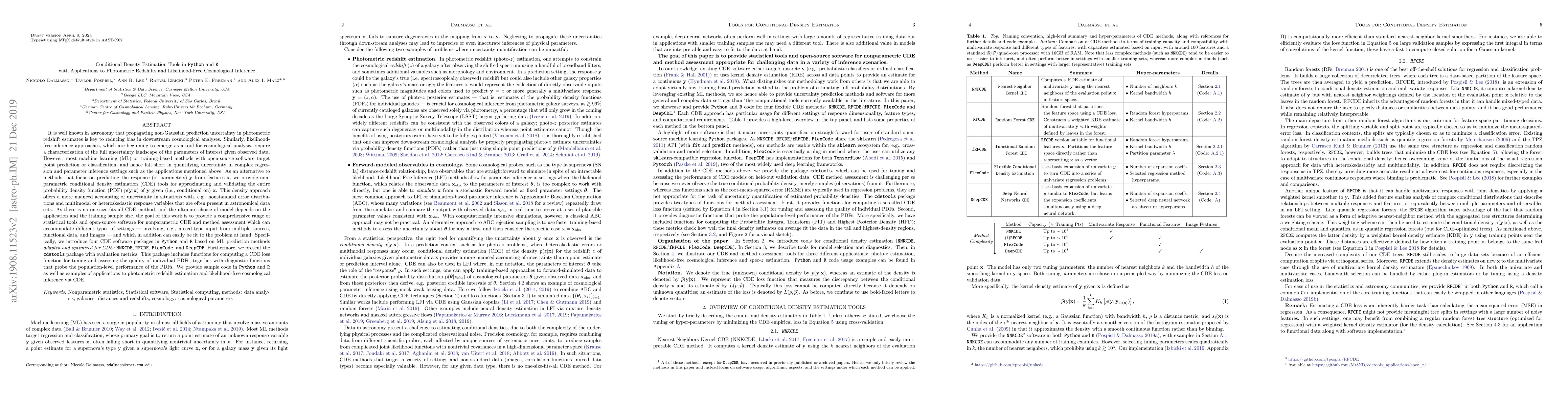 This paper develops tools for nonparametric conditional density estimation in Python and R to improve photometric redshifts and likelihood-free cosmological inference, providing a range of software packages for accommodating different settings.