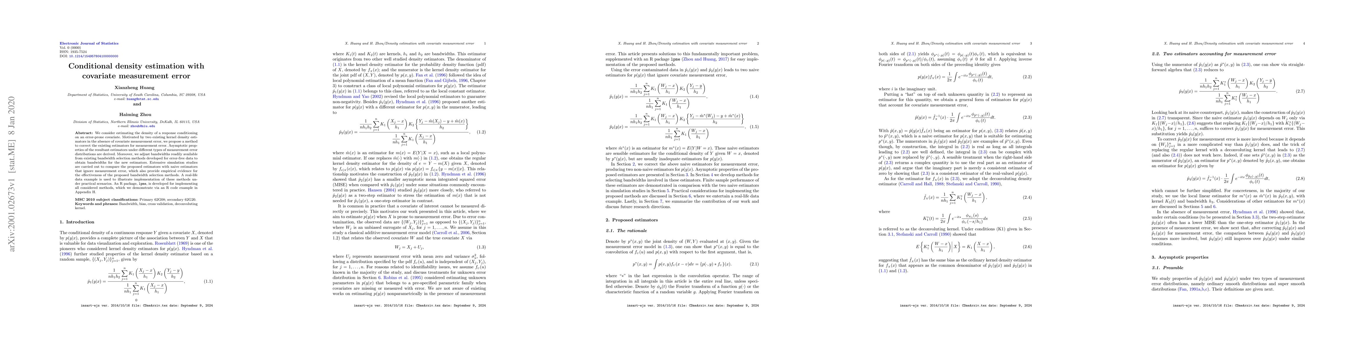 This paper proposes a method to correct existing kernel density estimators for measurement error in covariates, deriving their asymptotic properties and adjusting bandwidths for error-prone data. Simulation studies and a real-life data example demonstrate the effectiveness of the proposed approach, with an R package, lpme, developed for practical implementation.