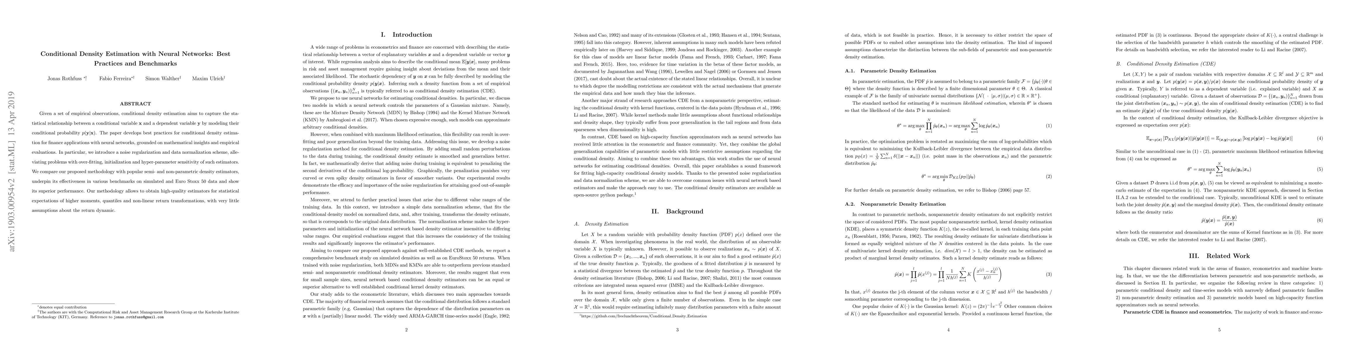 This paper develops best practices for neural network-based conditional density estimation in finance, introducing noise regularization and data normalization to mitigate overfitting. It benchmarks the proposed methodology against semi- and non-parametric estimators, demonstrating superior performance on both simulated and Euro Stoxx 50 data.