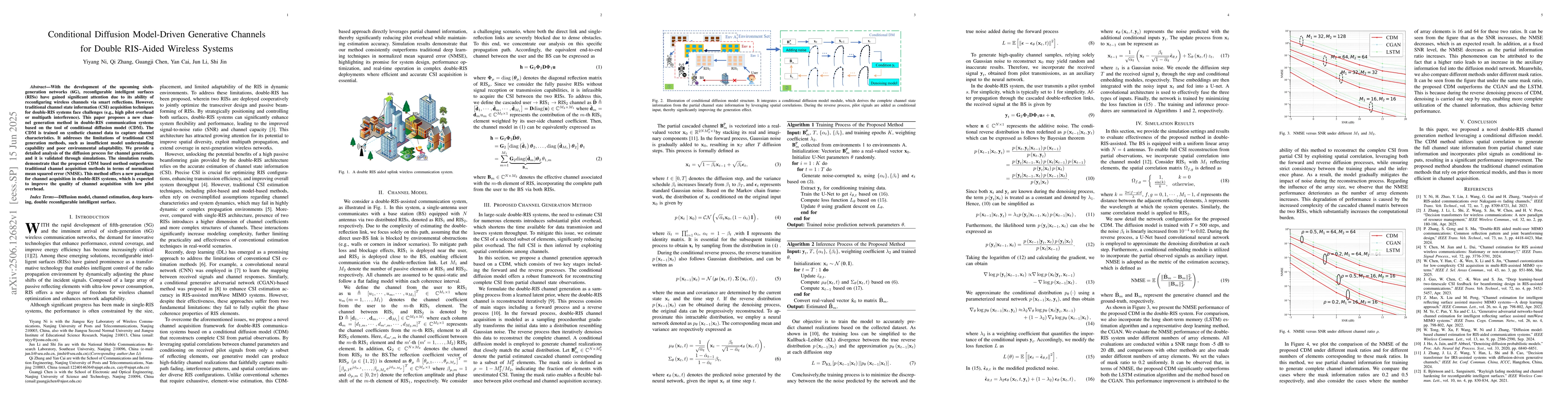 The paper introduces a CDM-driven generative channel approach for double-RIS aided wireless systems, which efficiently reconstructs complete CSI from partial observations by exploiting spatial correlations.