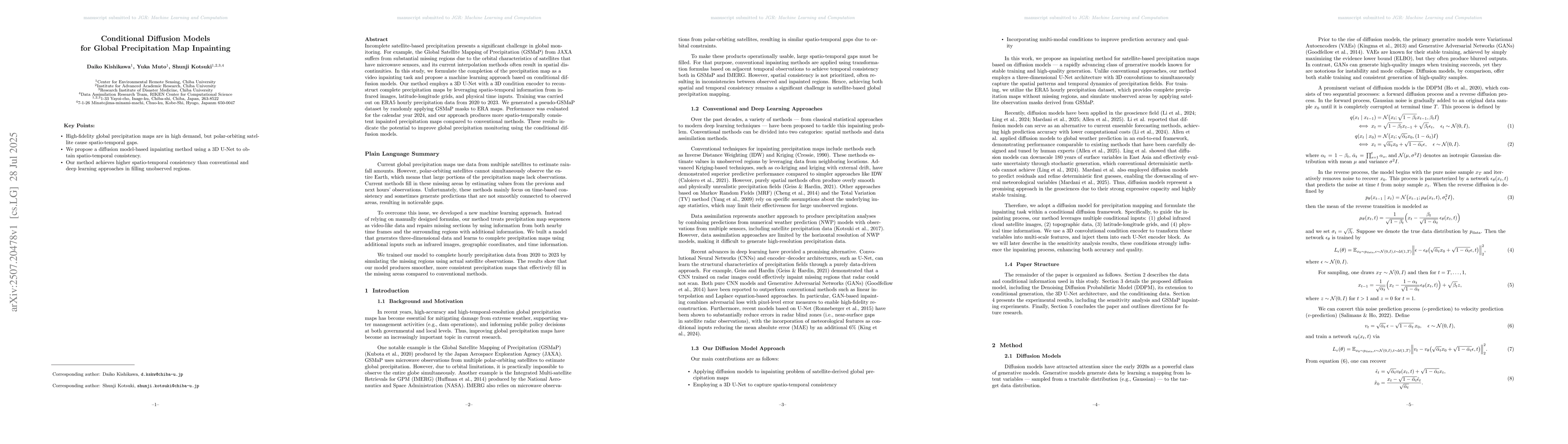 Incomplete satellite-based precipitation presents a significant challenge in global monitoring. For example, the Global Satellite Mapping of Precipitation (GSMaP) from JAXA suffers from substantial missing regions due to the orbital characteristics of satellites that have microwave sensors, and its current interpolation methods often result in spatial discontinuities. In this study, we formulate the completion of the precipitation map as a video inpainting task and propose a machine learning approach based on conditional diffusion models. Our method employs a 3D U-Net with a 3D condition encoder to reconstruct complete precipitation maps by leveraging spatio-temporal information from infrared images, latitude-longitude grids, and physical time inputs. Training was carried out on ERA5 hourly precipitation data from 2020 to 2023. We generated a pseudo-GSMaP dataset by randomly applying GSMaP masks to ERA maps. Performance was evaluated for the calendar year 2024, and our approach produces more spatio-temporally consistent inpainted precipitation maps compared to conventional methods. These results indicate the potential to improve global precipitation monitoring using the conditional diffusion models.