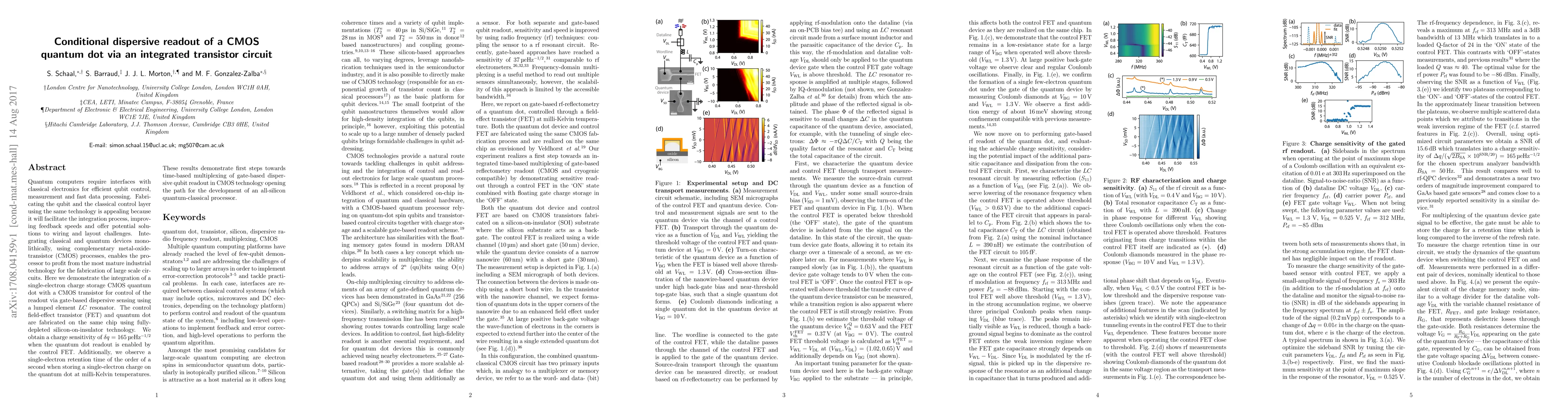 Quantum computers require interfaces with classical electronics for efficient qubit control, measurement and fast data processing. Fabricating the qubit and the classical control layer using the same technology is appealing because it will facilitate the integration process, improving feedback speeds and offer potential solutions to wiring and layout challenges. Integrating classical and quantum devices monolithically, using complementary metal-oxide-transistor (CMOS) processes, enables the processor to profit from the most mature industrial technology for the fabrication of large scale circuits. Here we demonstrate the integration of a single-electron charge storage CMOS quantum dot with a CMOS transistor for control of the readout via gate-based dispersive sensing using a lumped element $LC$ resonator. The control field-effect transistor (FET) and quantum dot are fabricated on the same chip using fully-depleted silicon-on-insulator technology. We obtain a charge sensitivity of $\delta q=165\, \mu e \mathrm{Hz}^{-1/2}$ when the quantum dot readout is enabled by the control FET. Additionally, we observe a single-electron retention time of the order of a second when storing a single-electron charge on the quantum dot at milli-Kelvin temperatures. These results demonstrate first steps towards time-based multiplexing of gate-based dispersive qubit readout in CMOS technology opening the path for the development of an all-silicon quantum-classical processor.