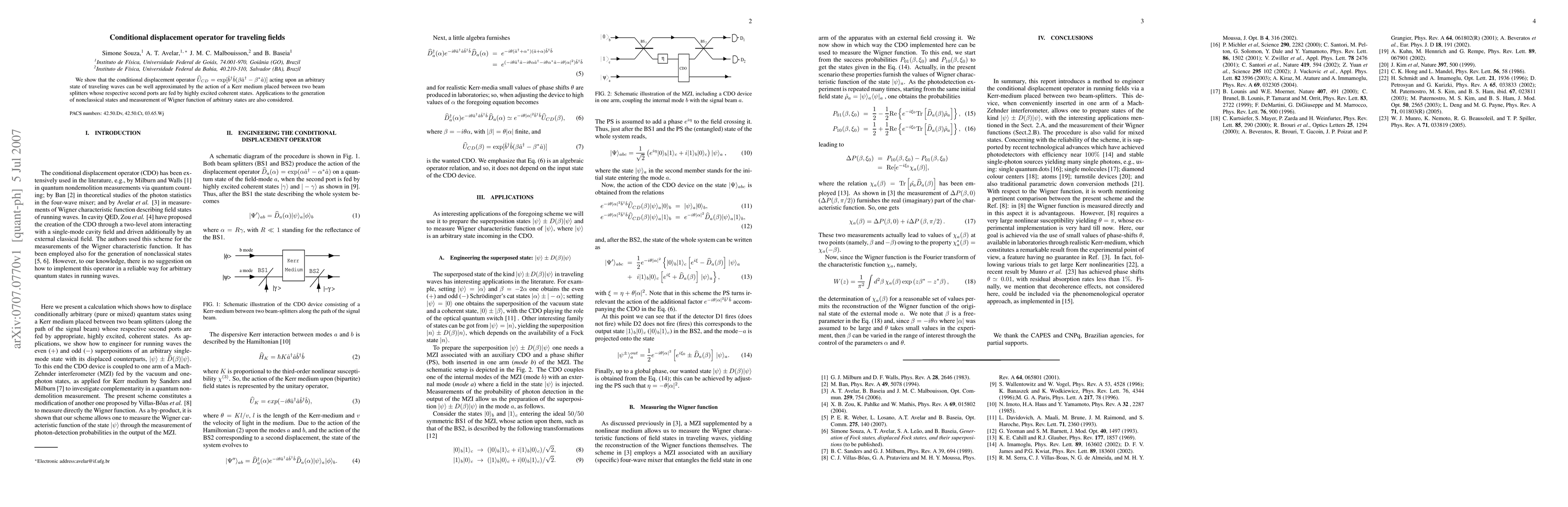 We show that the conditional displacement operator $\hat{U}_{CD}=\exp [\hat{b}^{\dagger}\hat{b}(\beta \hat{a}^{\dagger}-\beta ^{\ast}\hat{a})]$ acting upon an arbitrary state of traveling waves can be well approximated by the action of a Kerr medium placed between two beam splitters whose respective second ports are fed by highly excited coherent states. Applications to the generation of nonclassical states and measurement of Wigner function of arbitrary states are also considered.