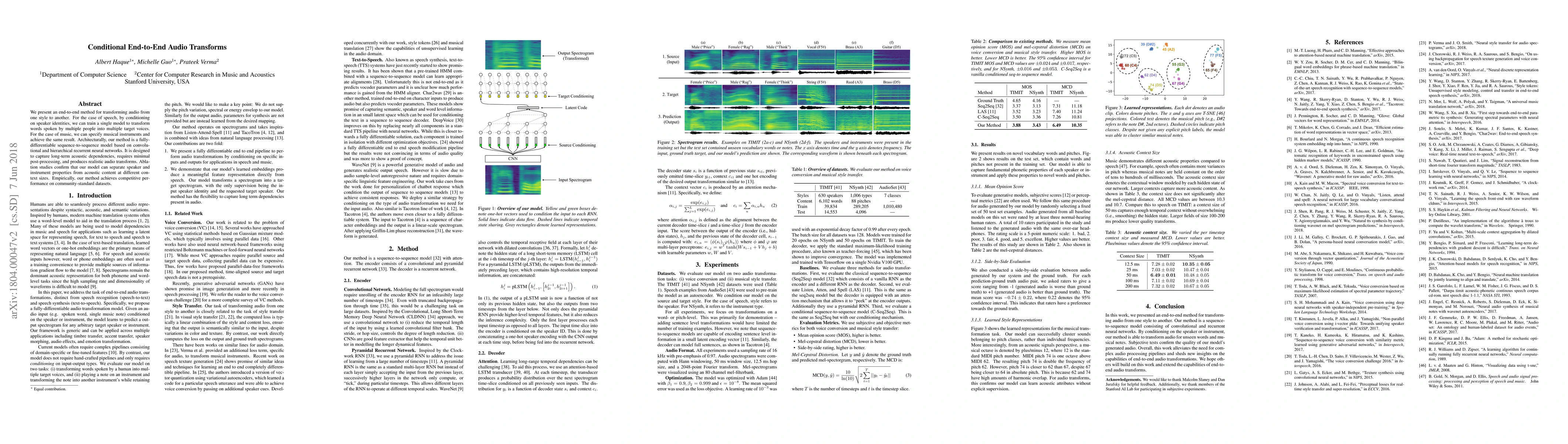 We present an end-to-end method for transforming audio from one style to another. For the case of speech, by conditioning on speaker identities, we can train a single model to transform words spoken by multiple people into multiple target voices. For the case of music, we can specify musical instruments and achieve the same result. Architecturally, our method is a fully-differentiable sequence-to-sequence model based on convolutional and hierarchical recurrent neural networks. It is designed to capture long-term acoustic dependencies, requires minimal post-processing, and produces realistic audio transforms. Ablation studies confirm that our model can separate speaker and instrument properties from acoustic content at different receptive fields. Empirically, our method achieves competitive performance on community-standard datasets.