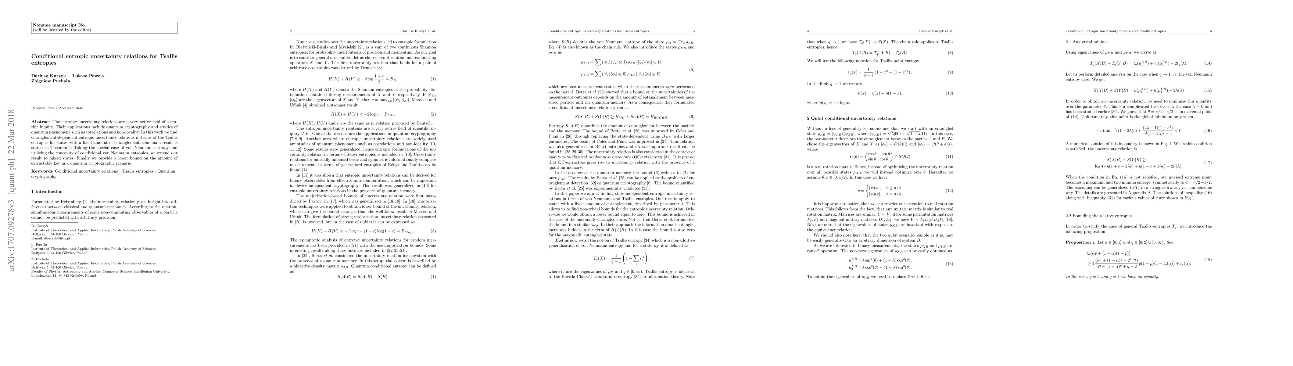 This paper develops entanglement-dependent entropic uncertainty relations using Tsallis entropies, extending the results to mixed states via the concavity of conditional von Neumann entropies. It also provides a lower bound on the extractable key in quantum cryptography.