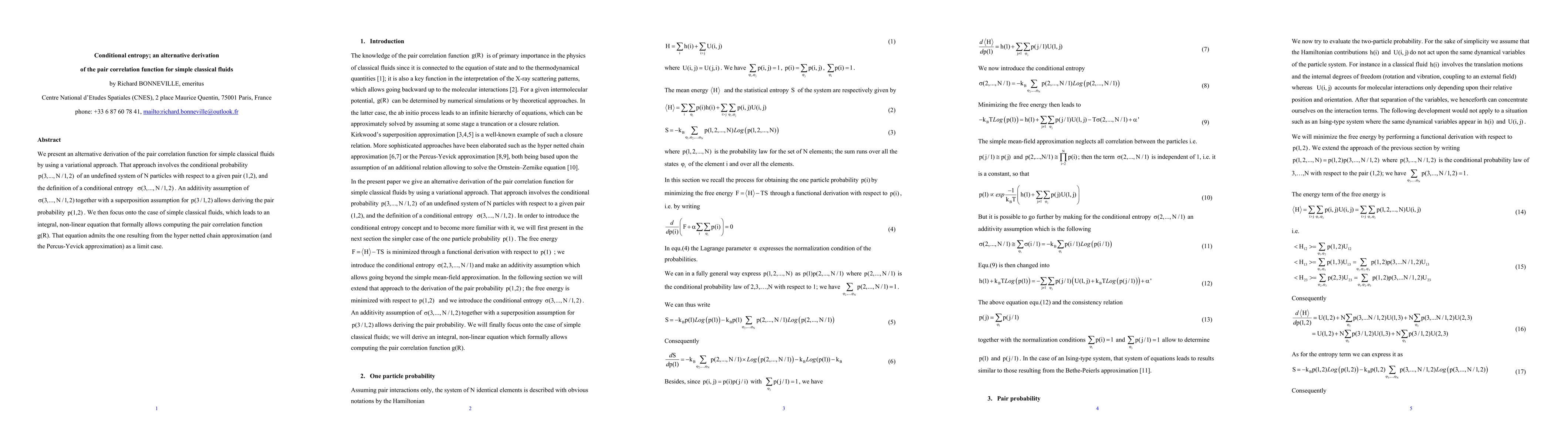 This paper derives the pair correlation function for simple classical fluids using a variational approach based on conditional entropy and probability. The method leads to a non-linear integral equation that encompasses known approximations as special cases.