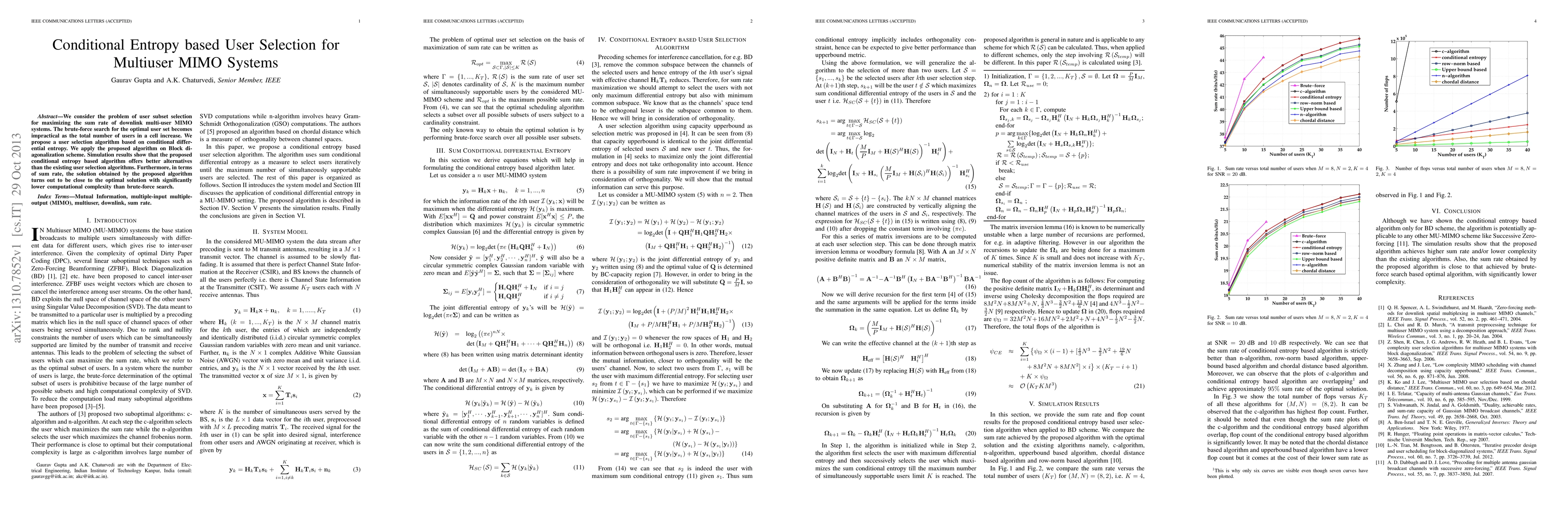 We consider the problem of user subset selection for maximizing the sum rate of downlink multi-user MIMO systems. The brute-force search for the optimal user set becomes impractical as the total number of users in a cell increase. We propose a user selection algorithm based on conditional differential entropy. We apply the proposed algorithm on Block diagonalization scheme. Simulation results show that the proposed conditional entropy based algorithm offers better alternatives than the existing user selection algorithms. Furthermore, in terms of sum rate, the solution obtained by the proposed algorithm turns out to be close to the optimal solution with significantly lower computational complexity than brute-force search.
