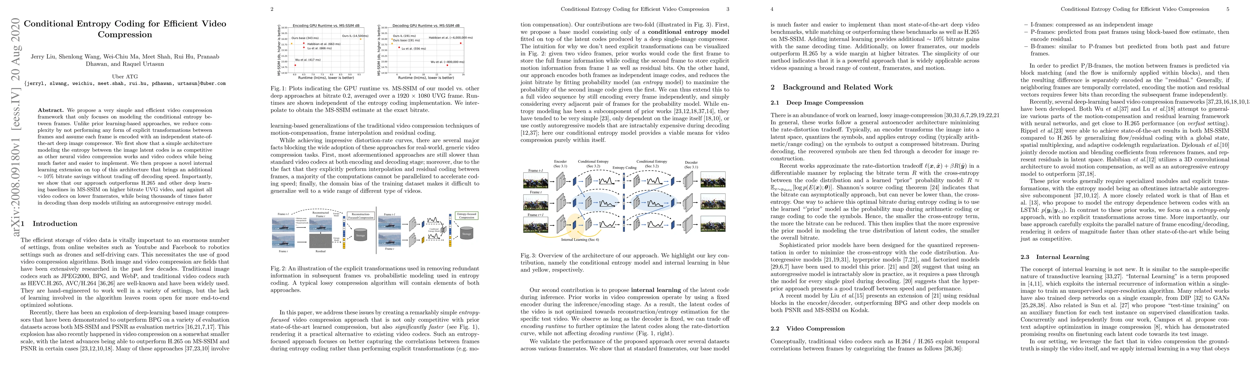 We propose a very simple and efficient video compression framework that only focuses on modeling the conditional entropy between frames. Unlike prior learning-based approaches, we reduce complexity by not performing any form of explicit transformations between frames and assume each frame is encoded with an independent state-of-the-art deep image compressor. We first show that a simple architecture modeling the entropy between the image latent codes is as competitive as other neural video compression works and video codecs while being much faster and easier to implement. We then propose a novel internal learning extension on top of this architecture that brings an additional 10% bitrate savings without trading off decoding speed. Importantly, we show that our approach outperforms H.265 and other deep learning baselines in MS-SSIM on higher bitrate UVG video, and against all video codecs on lower framerates, while being thousands of times faster in decoding than deep models utilizing an autoregressive entropy model.