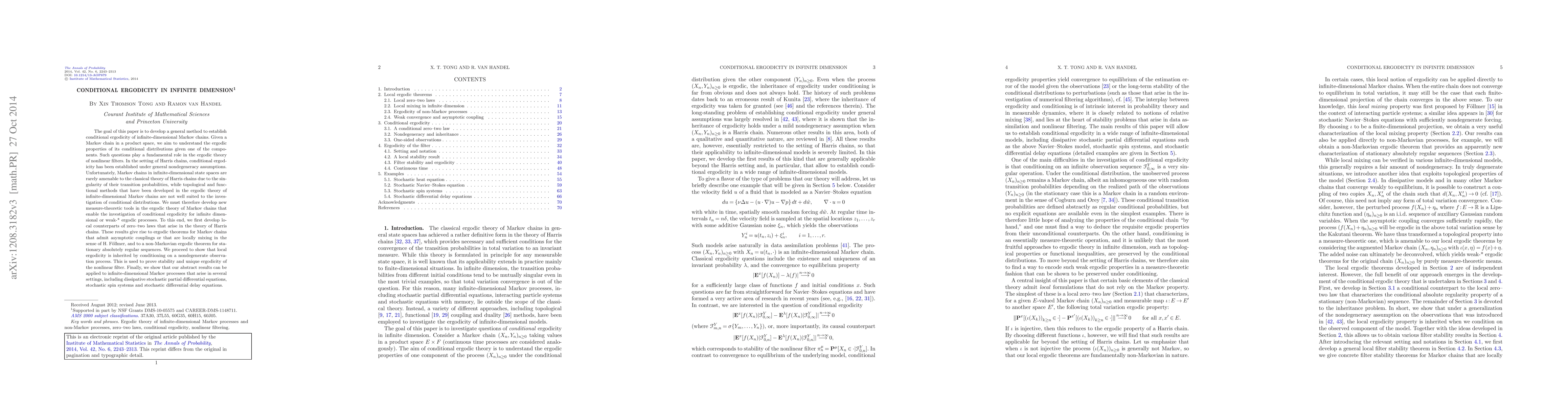 This paper develops a method to establish conditional ergodicity of infinite-dimensional Markov chains, enabling investigation of ergodic properties under specific conditions. It also applies the results to various settings, including nonlinear filters in dissipative stochastic systems.