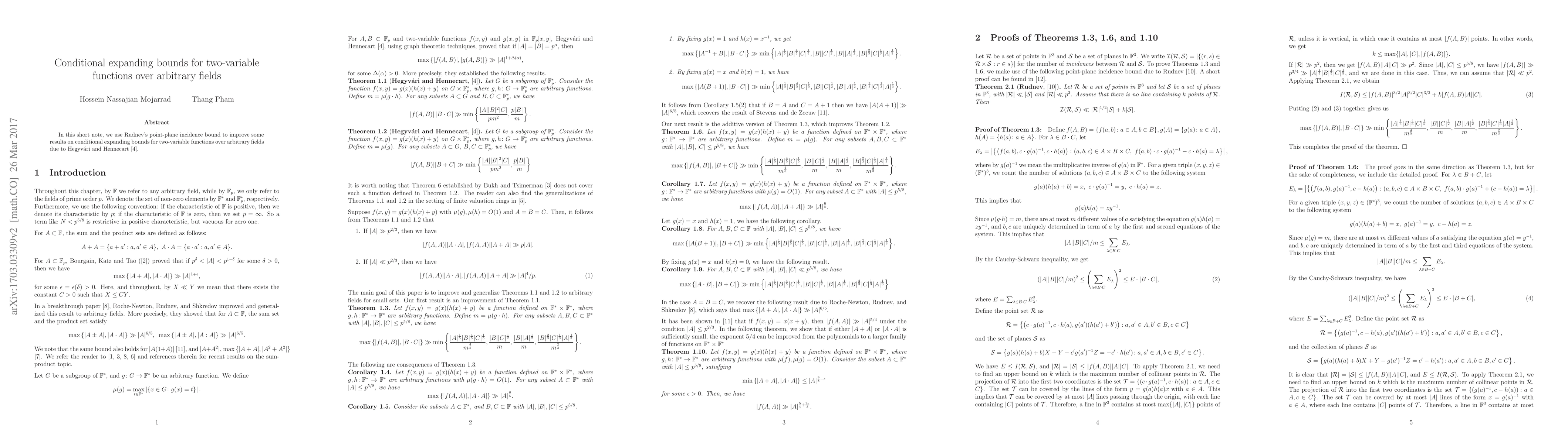 Summary: This paper leverages Rudnev's point-plane incidence bound to enhance the conditional expanding bounds for two-variable functions over any field, improving upon previous results established by Hegyvári and Hennecart.