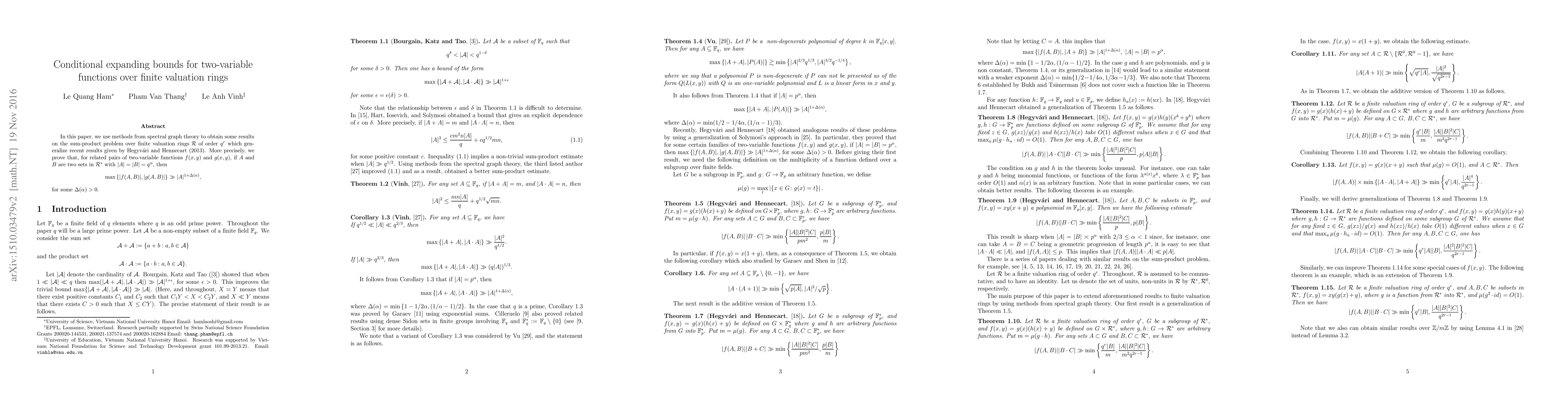 This paper leverages spectral graph theory to derive new bounds for two-variable functions over finite valuation rings, extending prior work by Hegyvári and Hennecart. It establishes that for related pairs of functions, the size of their images over certain sets is significantly larger than the size of the sets themselves.
