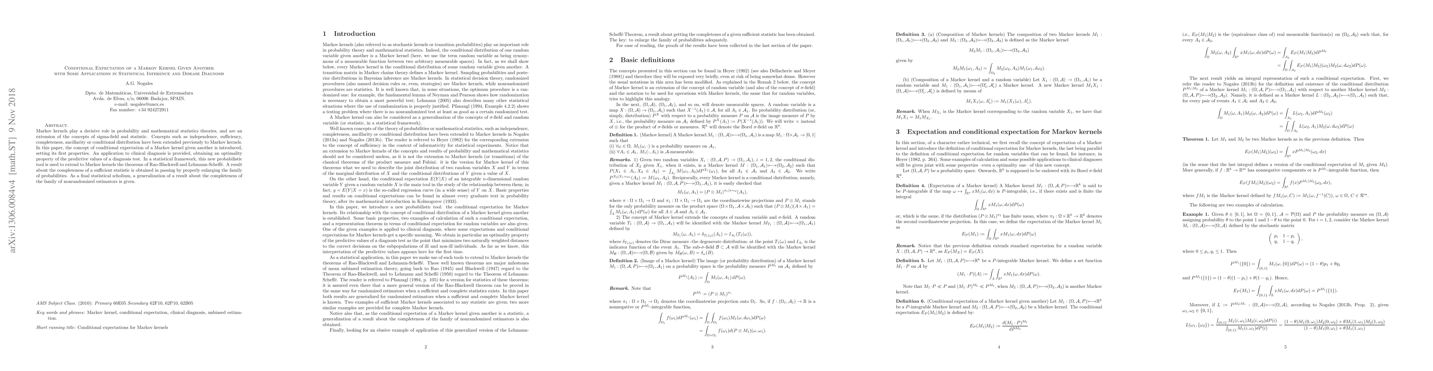 This paper introduces the concept of conditional expectation for Markov kernels, establishing foundational properties. It applies this new probabilistic tool to extend statistical inference theorems and discusses its implications in clinical diagnosis, demonstrating the optimality of predictive values for diagnosis tests.