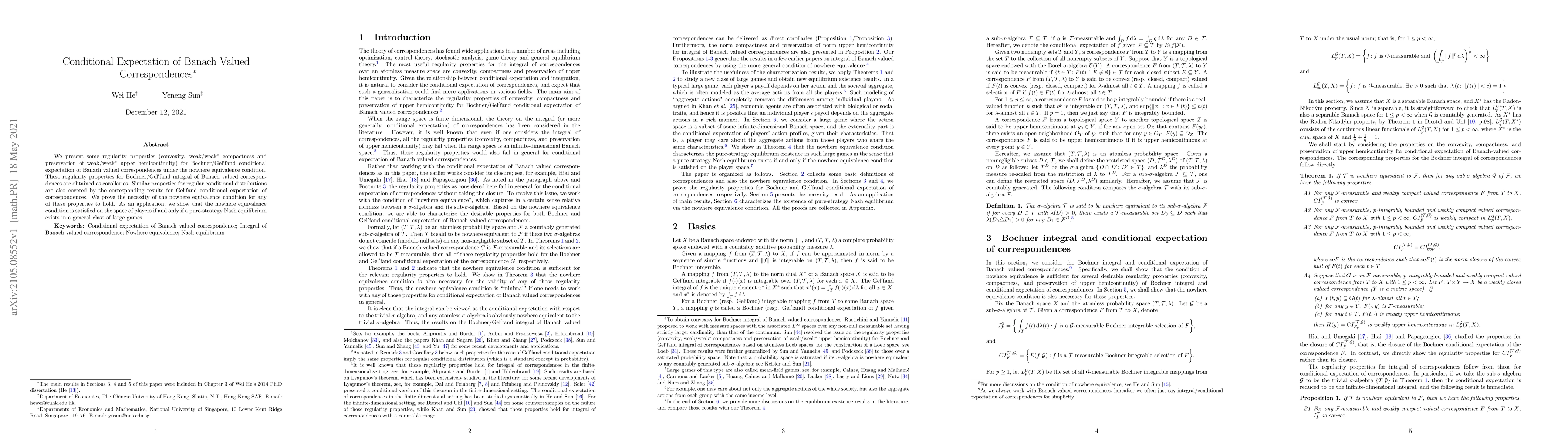 This paper explores regularity properties of Banach valued correspondences under conditional expectation, proving the necessity of the nowhere equivalence condition for these properties. It also demonstrates the application of these conditions in the existence of pure-strategy Nash equilibria in large games.