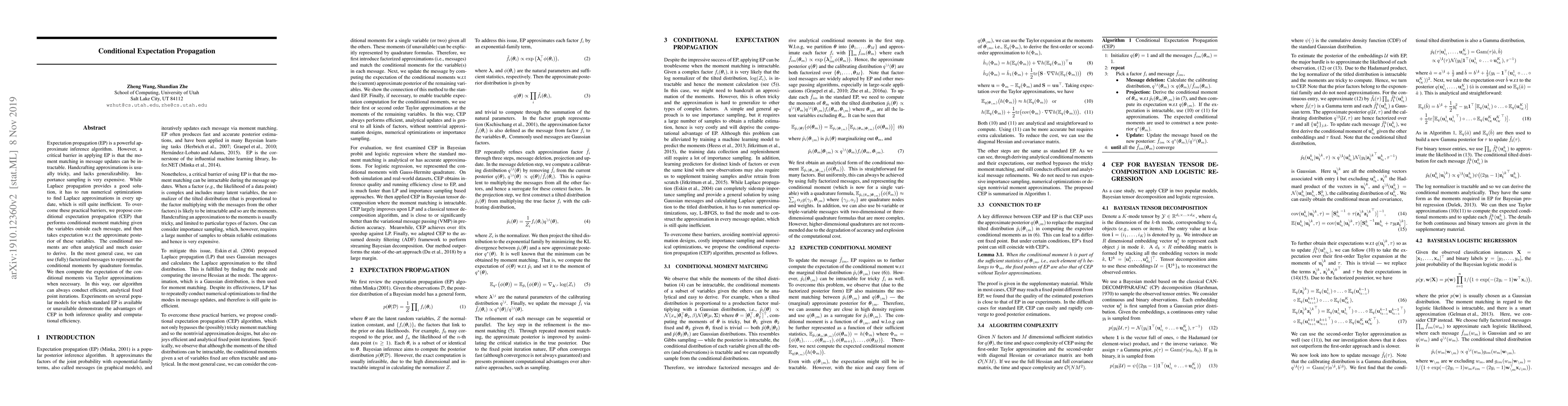 Expectation propagation (EP) is a powerful approximate inference algorithm. However, a critical barrier in applying EP is that the moment matching in message updates can be intractable. Handcrafting approximations is usually tricky, and lacks generalizability. Importance sampling is very expensive. While Laplace propagation provides a good solution, it has to run numerical optimizations to find Laplace approximations in every update, which is still quite inefficient. To overcome these practical barriers, we propose conditional expectation propagation (CEP) that performs conditional moment matching given the variables outside each message, and then takes expectation w.r.t the approximate posterior of these variables. The conditional moments are often analytical and much easier to derive. In the most general case, we can use (fully) factorized messages to represent the conditional moments by quadrature formulas. We then compute the expectation of the conditional moments via Taylor approximations when necessary. In this way, our algorithm can always conduct efficient, analytical fixed point iterations. Experiments on several popular models for which standard EP is available or unavailable demonstrate the advantages of CEP in both inference quality and computational efficiency.