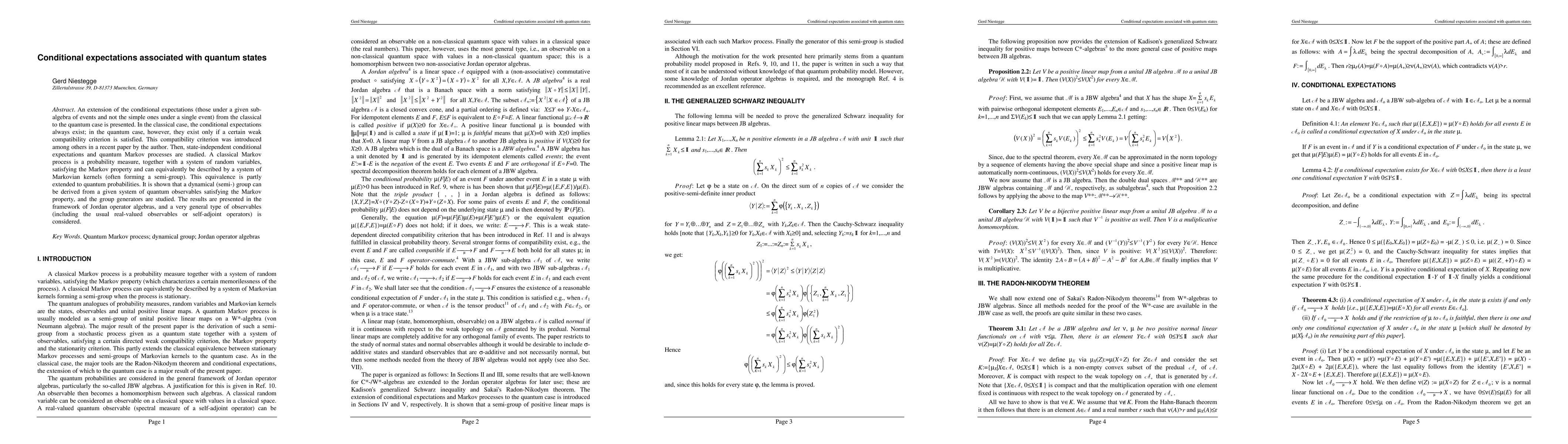 This paper extends classical conditional expectations to quantum states, revealing that quantum conditional expectations exist only under a compatibility criterion. It explores state-independent conditional expectations and quantum Markov processes, showing that quantum dynamical groups can be derived from quantum observables satisfying the Markov property.