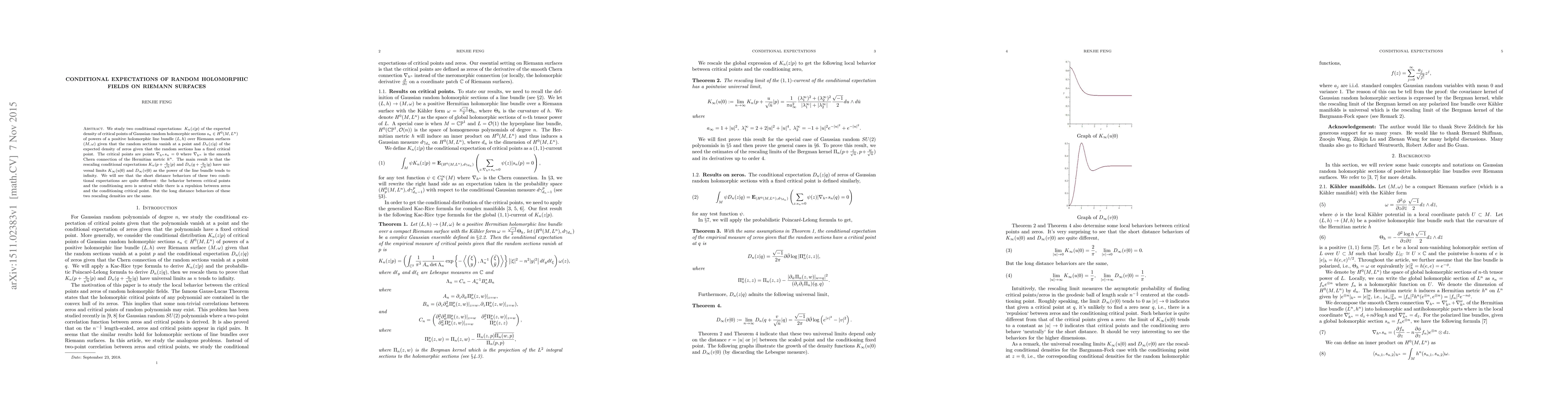 This paper investigates the conditional expectations of critical points and zeros in Gaussian random holomorphic sections on Riemann surfaces, revealing universal limits as the power of the line bundle increases. The study finds neutral short-distance behavior and repulsion between zeros and critical points, while long-distance behaviors remain consistent.
