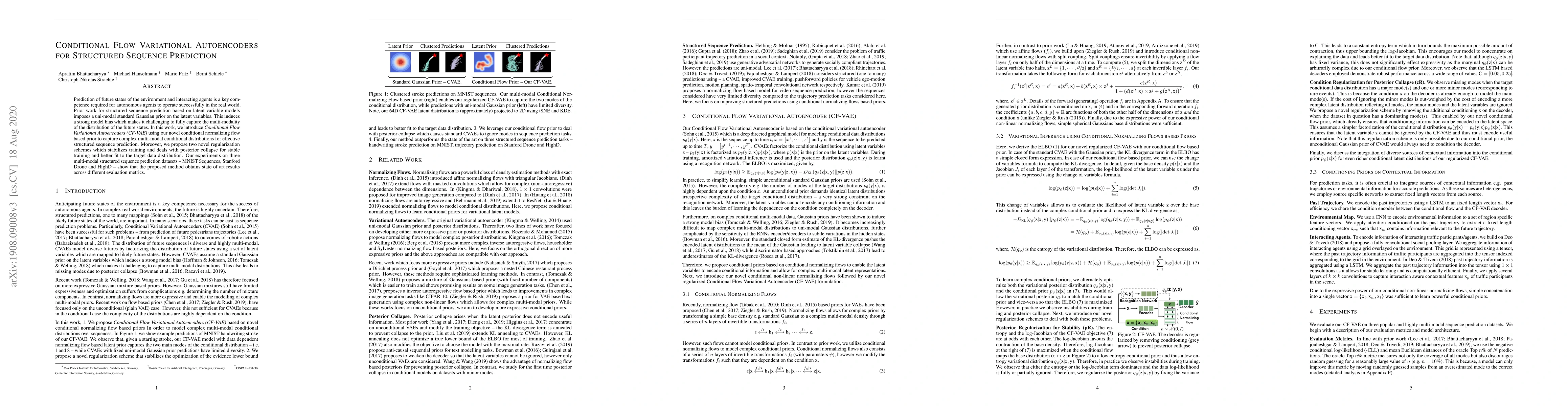 This paper introduces Conditional Flow Variational Autoencoders (CF-VAE) to predict structured sequences by using a novel conditional normalizing flow-based prior to capture complex multi-modal distributions. It also proposes two regularization schemes to stabilize training and improve fit to data, achieving state-of-the-art results on three multi-modal datasets.