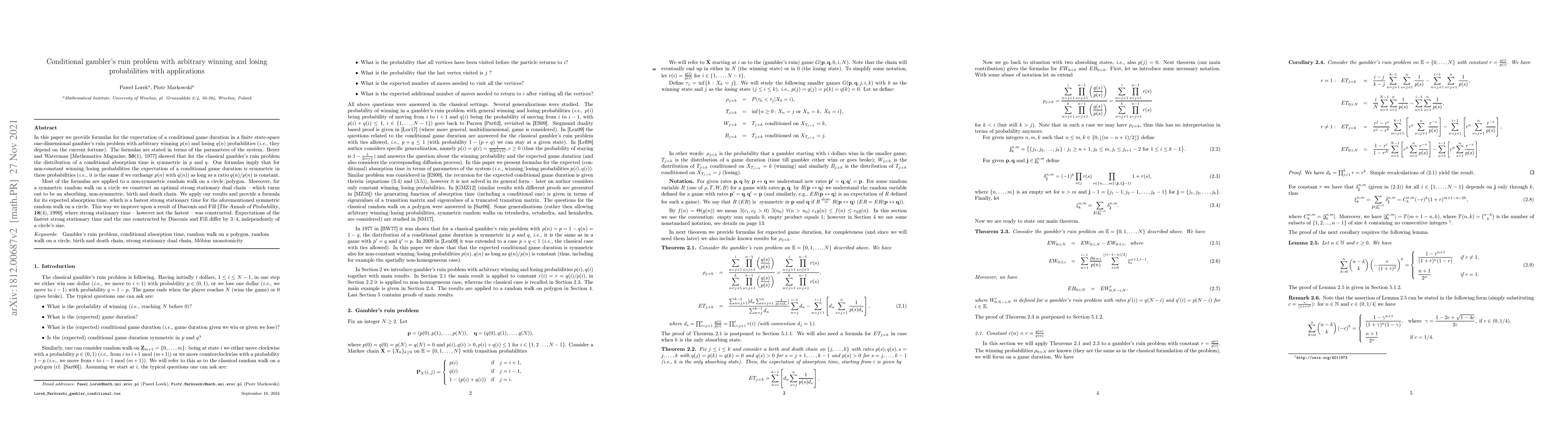 In this paper we provide formulas for the expectation of a conditional game duration in a finite state-space one-dimensional gambler's ruin problem with arbitrary winning $p(n)$ and losing $q(n)$ probabilities (i.e., they depend on the current fortune). The formulas are stated in terms of the parameters of the system. Beyer and Waterman [Mathematics Magazine, 50(1), 1977] showed that for the classical gambler's ruin problem the distribution of a conditional absorption time is symmetric in $p$ and $q$. Our formulas imply that for non-constant winning/losing probabilities the expectation of a conditional game duration is symmetric in these probabilities (i.e., it is the same if we exchange $p(n)$ with $q(n)$) as long as a ratio $q(n)/p(n)$ is constant. Most of the formulas are applied to a non-symmetric random walk on a circle/polygon. Moreover, for a symmetric random walk on a circle we construct an optimal strong stationary dual chain -- which turns out to be an absorbing, non-symmetric, birth and death chain. We apply our results and provide a formula for its expected absorption time, which is a fastest strong stationary time for the aforementioned symmetric random walk on a circle. This way we improve upon a result of Diaconis and Fill [The Annals of Probability, 18(4), 1990], where strong stationary time -- however not the fastest -- was constructed. Expectations of the fastest strong stationary time and the one constructed by Diaconis and Fill differ by 3/4, independently of a circle's size.