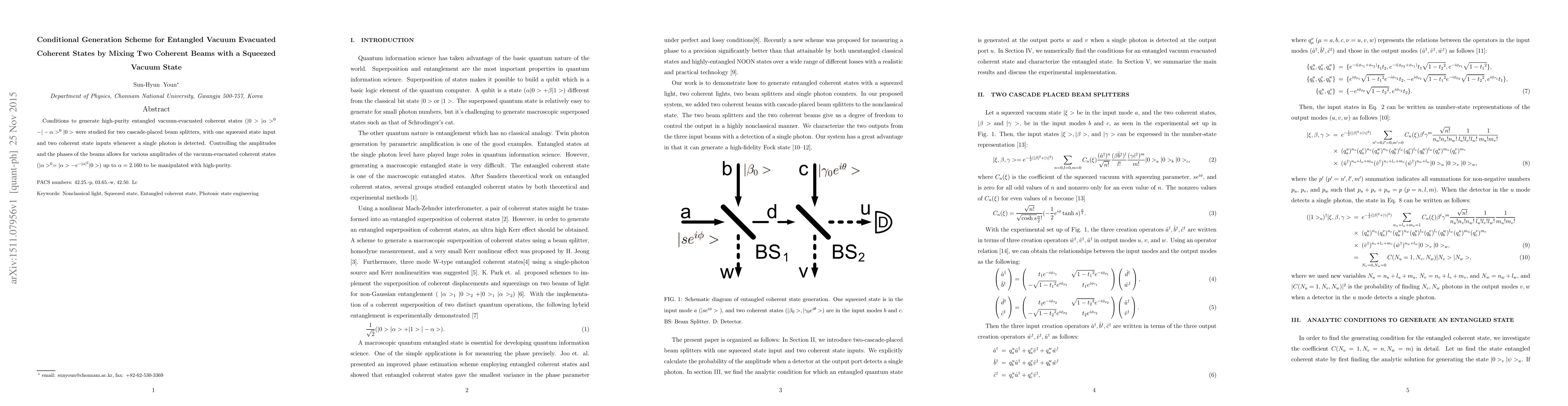 This research explores the conditions for generating entangled vacuum-evacuated coherent states using two cascade beam splitters, a squeezed vacuum, and two coherent beams. By detecting a single photon and adjusting beam amplitudes and phases, high-purity entangled states with amplitudes up to $\alpha = 2.160$ can be achieved.