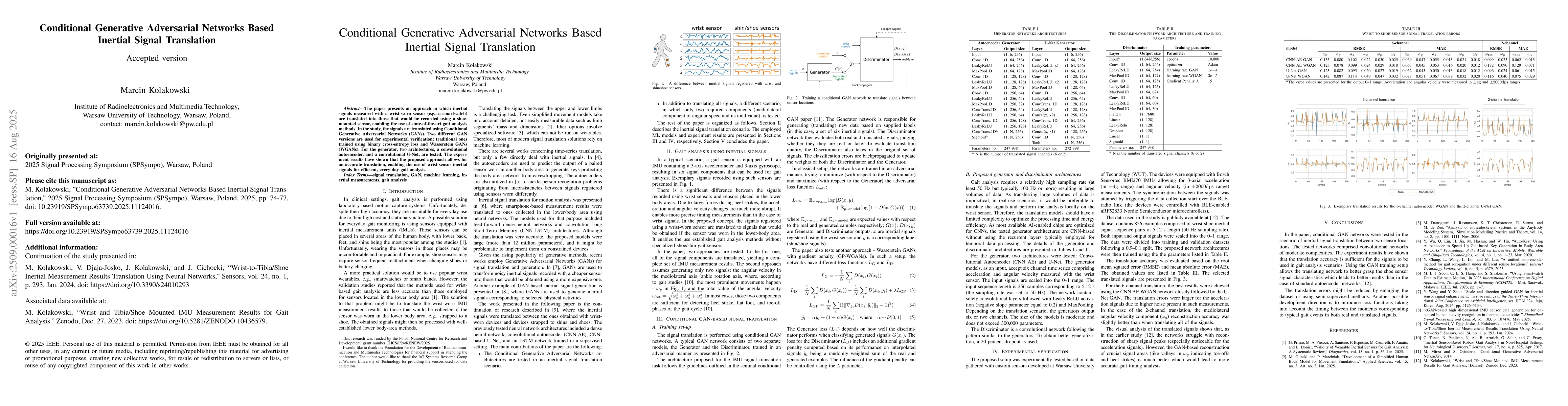 The paper presents an approach in which inertial signals measured with a wrist-worn sensor (e.g., a smartwatch) are translated into those that would be recorded using a shoe-mounted sensor, enabling the use of state-of-the-art gait analysis methods. In the study, the signals are translated using Conditional Generative Adversarial Networks (GANs). Two different GAN versions are used for experimental verification: traditional ones trained using binary cross-entropy loss and Wasserstein GANs (WGANs). For the generator, two architectures, a convolutional autoencoder, and a convolutional U-Net, are tested. The experiment results have shown that the proposed approach allows for an accurate translation, enabling the use of wrist sensor inertial signals for efficient, every-day gait analysis.