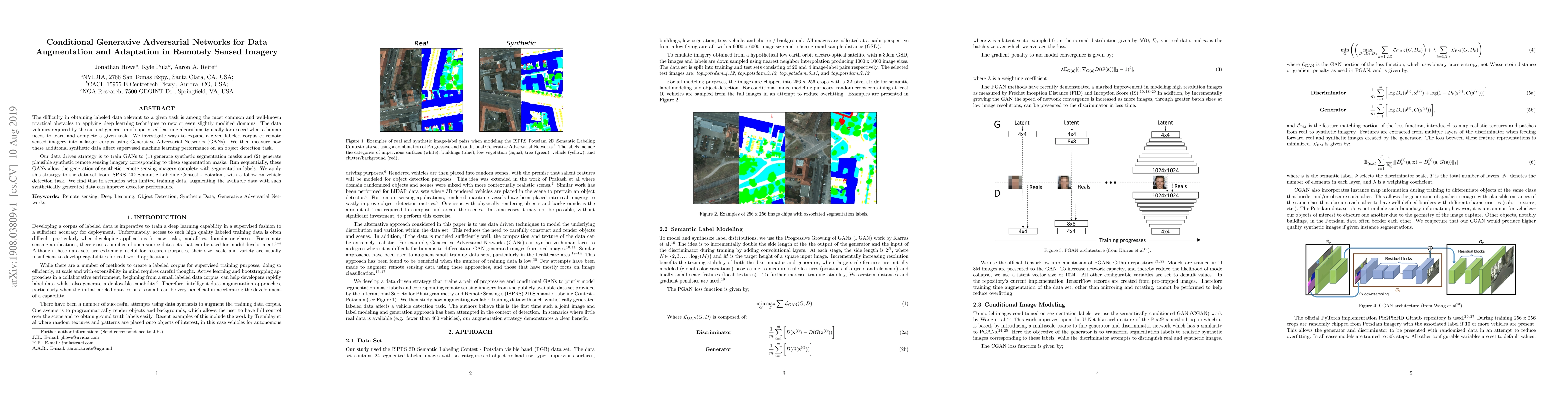 This paper explores the use of Conditional Generative Adversarial Networks (GANs) to augment and adapt a limited labeled dataset of remote sensing imagery for improved object detection. The study generates synthetic segmentation masks and corresponding imagery, which, when added to the training set, enhance supervised learning performance, particularly in data-scarce scenarios.