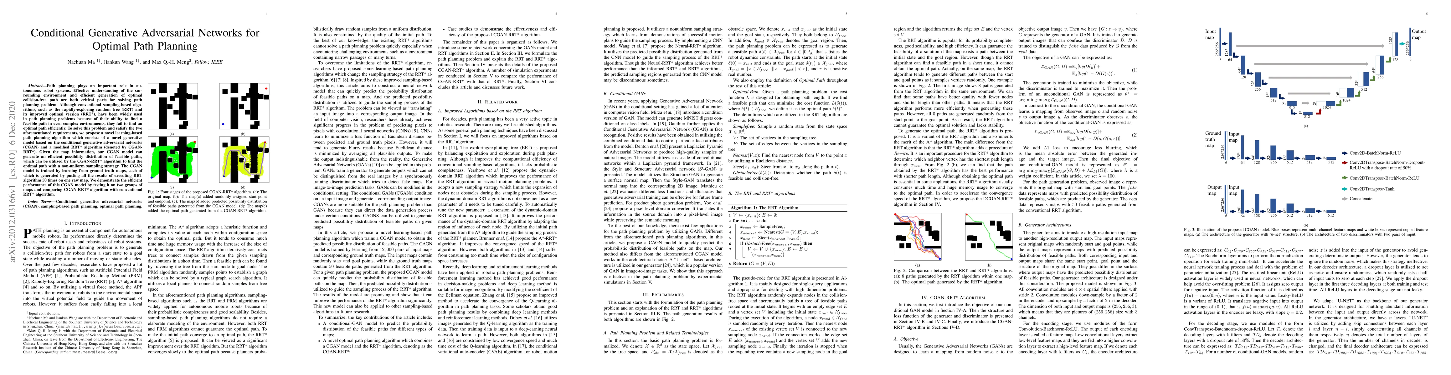 The paper proposes a novel path planning algorithm, CGAN-RRT*, which combines a Conditional Generative Adversarial Network (CGAN) with a modified RRT* algorithm. The CGAN model is trained on maps generated by executing the RRT algorithm 50 times, learning to predict a probability distribution of feasible paths. The CGAN-RRT* algorithm uses this distribution to guide a non-uniform sampling strategy for finding an optimal collision-free path.