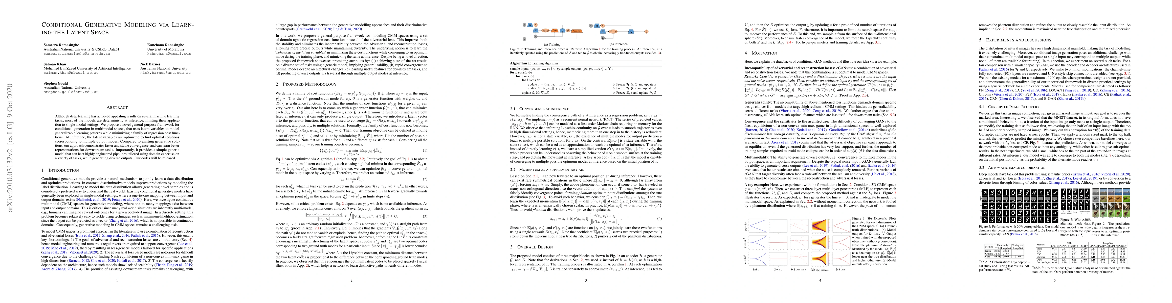 Although deep learning has achieved appealing results on several machine learning tasks, most of the models are deterministic at inference, limiting their application to single-modal settings. We propose a novel general-purpose framework for conditional generation in multimodal spaces, that uses latent variables to model generalizable learning patterns while minimizing a family of regression cost functions. At inference, the latent variables are optimized to find optimal solutions corresponding to multiple output modes. Compared to existing generative solutions, in multimodal spaces, our approach demonstrates faster and stable convergence, and can learn better representations for downstream tasks. Importantly, it provides a simple generic model that can beat highly engineered pipelines tailored using domain expertise on a variety of tasks, while generating diverse outputs. Our codes will be released.
