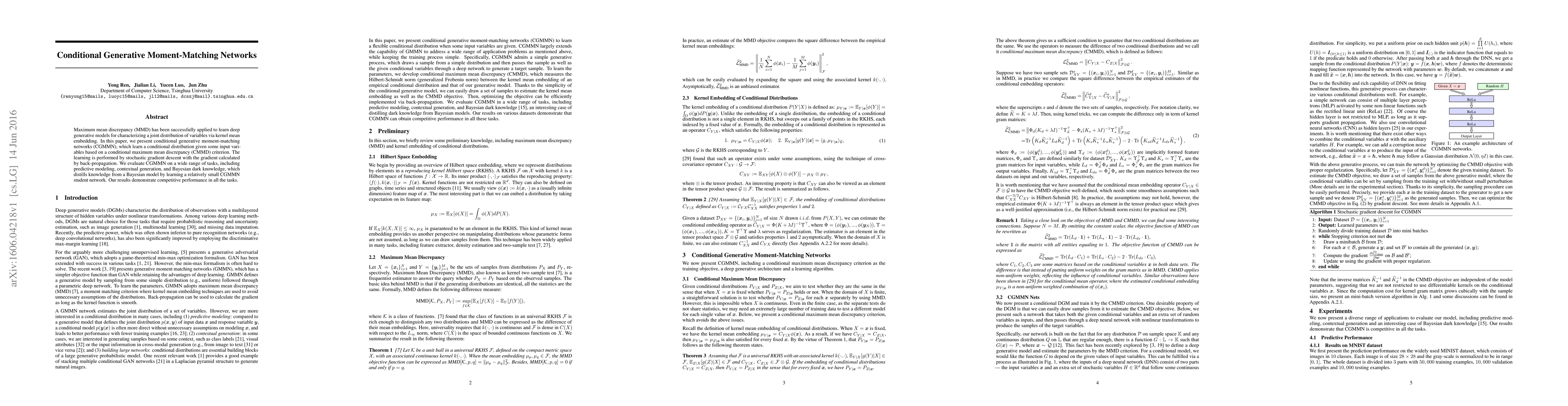 This paper introduces conditional generative moment-matching networks (CGMMN) that utilize conditional maximum mean discrepancy to learn conditional distributions. The method shows competitive performance across predictive modeling, contextual generation, and Bayesian dark knowledge tasks.