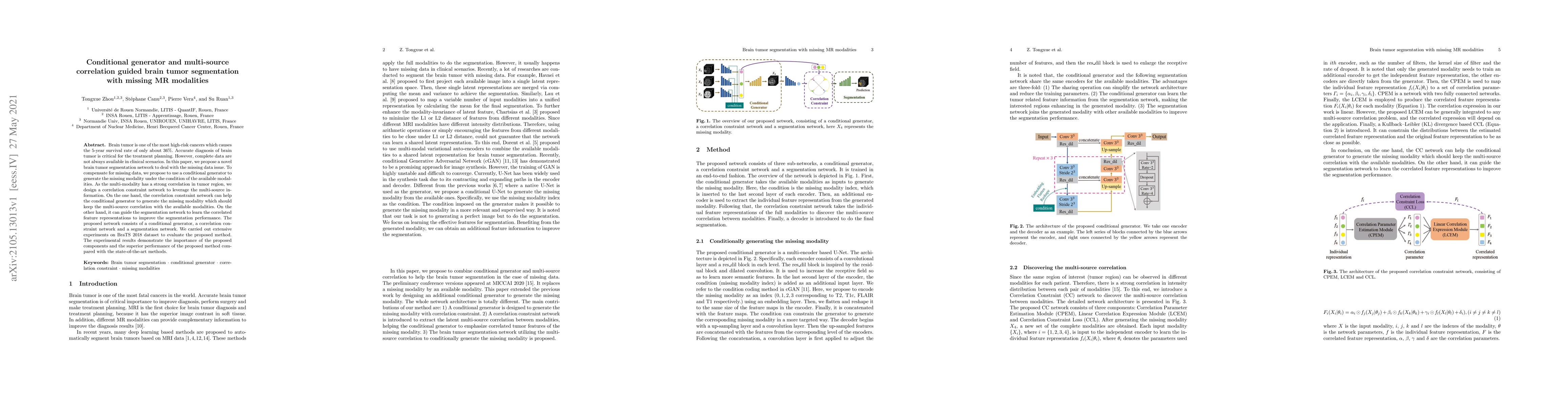 This paper proposes a novel brain tumor segmentation network to address missing MRI data by using a conditional generator to synthesize missing modalities and a correlation constraint network to leverage multi-source information. Experimental results on the BraTS 2018 dataset show superior performance compared to state-of-the-art methods.