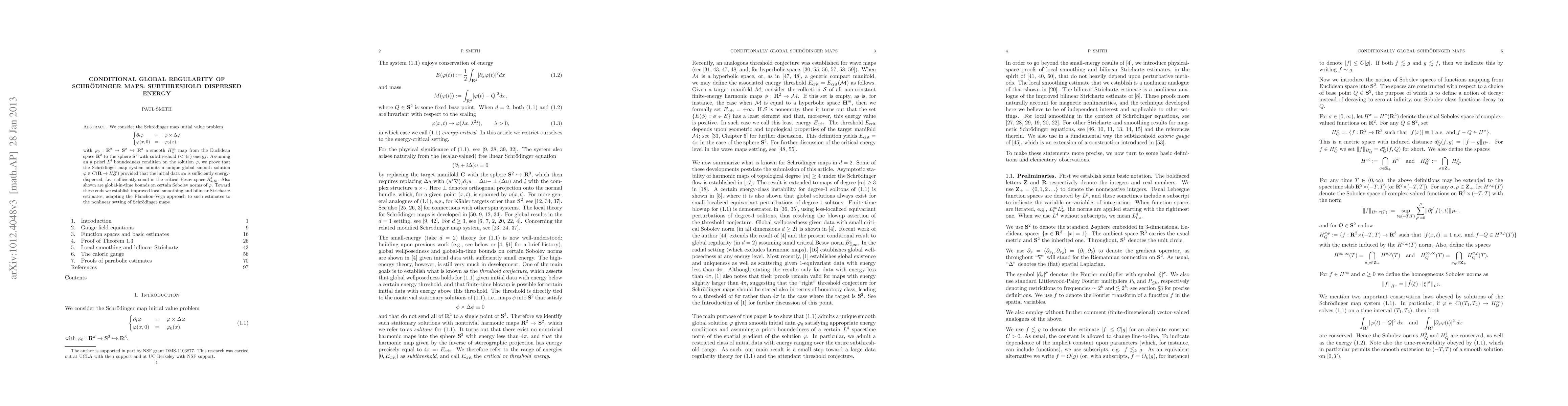 We consider the Schr\"odinger map initial value problem into the sphere in 2+1 dimensions with smooth, decaying, subthreshold initial data. Assuming an a priori $L^4$ boundedness condition on the solution, we prove that the Schr\"odinger map system admits a unique global smooth solution provided that the initial data is sufficiently energy-dispersed. Also shown are global-in-time bounds on certain Sobolev norms of the solution. Toward these ends we establish improved local smoothing and bilinear Strichartz estimates, adapting the Planchon-Vega approach to such estimates to the nonlinear setting of Schr\"odinger maps.