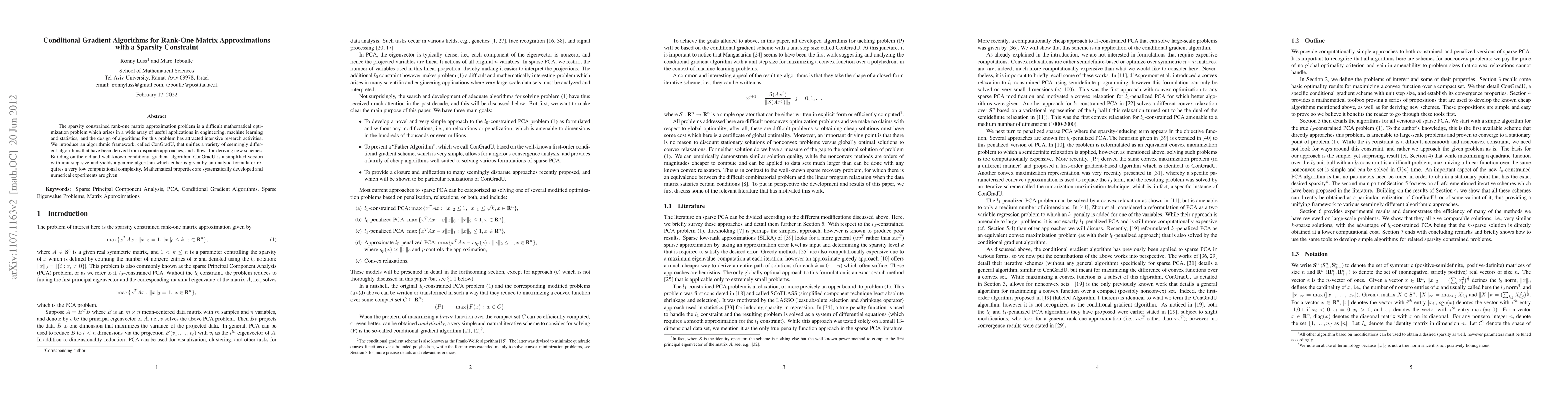 This paper introduces ConGradU, a new algorithmic framework for solving the sparsity-constrained rank-one matrix approximation problem, unifying various existing methods and offering either analytic solutions or low computational complexity. The framework is based on a simplified version of the conditional gradient algorithm with unit step size, supported by mathematical analysis and numerical experiments.
