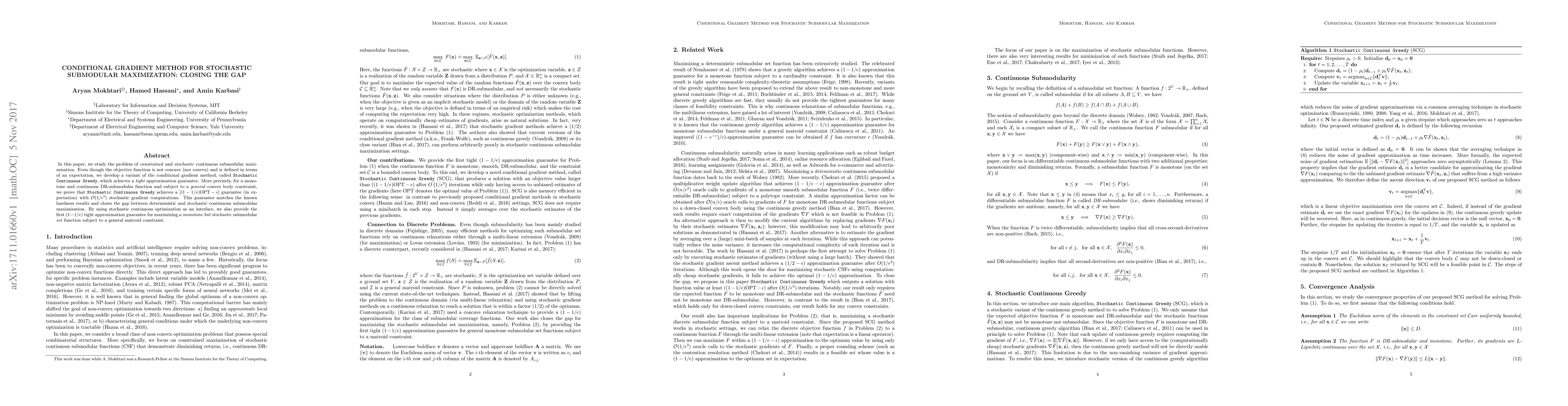 This paper develops a conditional gradient method for stochastic continuous submodular maximization, achieving a tight approximation guarantee of $[(1-1/e)\text{OPT} -\eps]$ with $\mathcal{O}{(1/\eps^3)}$ stochastic gradient computations, closing the gap between deterministic and stochastic approaches. It also provides the first $(1-1/e)$ approximation for maximizing a monotone stochastic submodular set function under a matroid constraint.