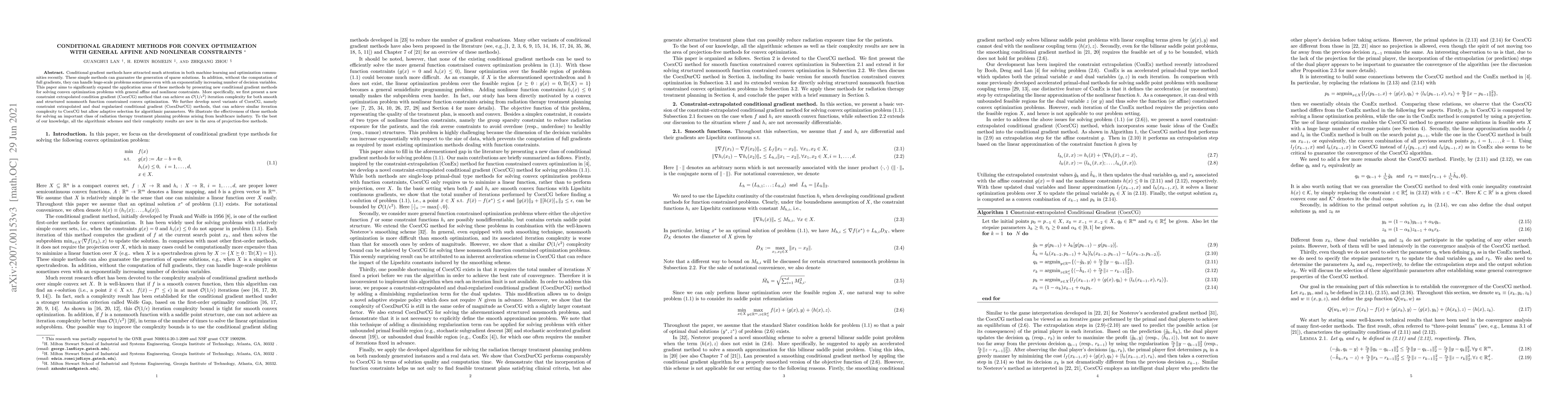 This paper introduces new conditional gradient methods, specifically the CoexCG and CoexDurCG, for solving convex optimization problems with general affine and nonlinear constraints. These methods achieve ${\cal O}(1/\epsilon^2)$ iteration complexity and allow adaptive parameter selection, demonstrating effectiveness in radiation therapy treatment planning.
