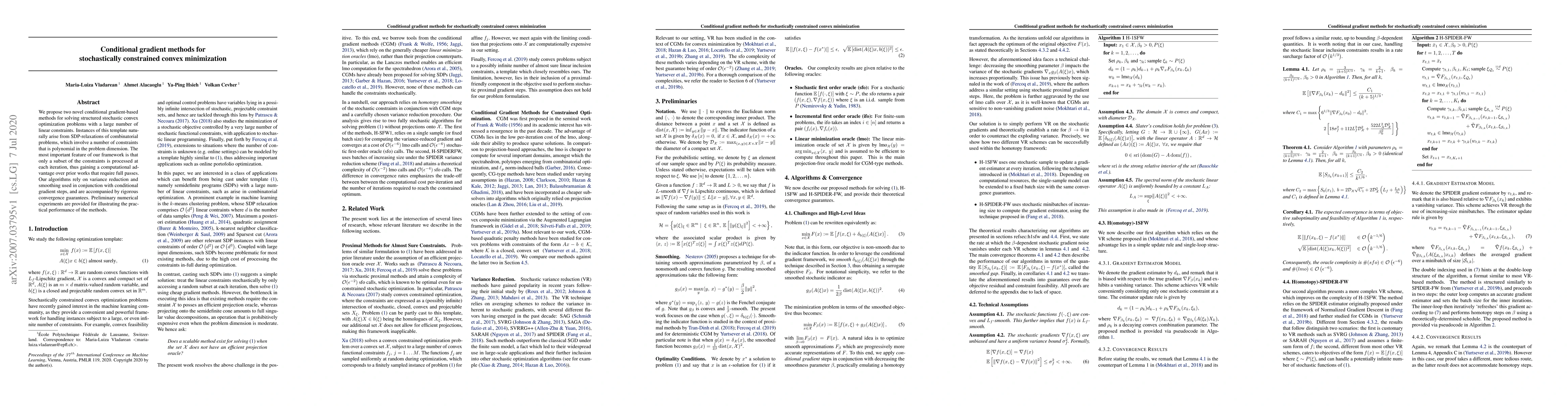 We propose two novel conditional gradient-based methods for solving structured stochastic convex optimization problems with a large number of linear constraints. Instances of this template naturally arise from SDP-relaxations of combinatorial problems, which involve a number of constraints that is polynomial in the problem dimension. The most important feature of our framework is that only a subset of the constraints is processed at each iteration, thus gaining a computational advantage over prior works that require full passes. Our algorithms rely on variance reduction and smoothing used in conjunction with conditional gradient steps, and are accompanied by rigorous convergence guarantees. Preliminary numerical experiments are provided for illustrating the practical performance of the methods.