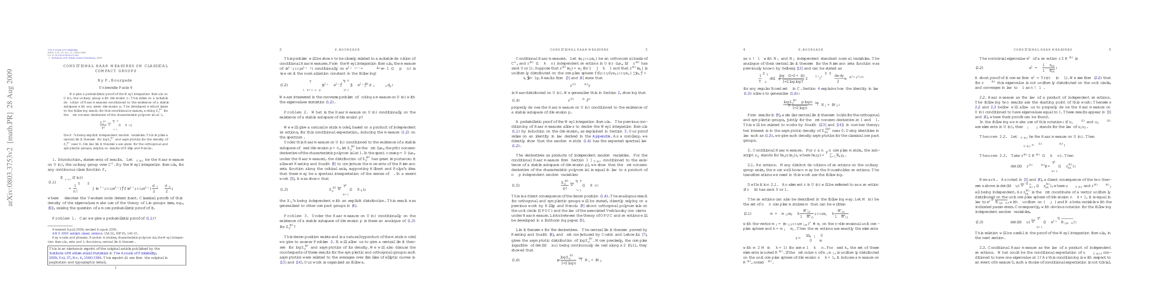 We give a probabilistic proof of the Weyl integration formula on U(n), the unitary group with dimension $n$. This relies on a suitable definition of Haar measures conditioned to the existence of a stable subspace with any given dimension $p$. The developed method leads to the following result: for this conditional measure, writing $Z_U^{(p)}$ for the first nonzero derivative of the characteristic polynomial at 1, \[\frac{Z_U^{(p)}}{p!}\stackrel{\mathrm{law}}{=}\prod_{\ell =1}^{n-p}(1-X_{\ell}),\] the $X_{\ell}$'s being explicit independent random variables. This implies a central limit theorem for $\log Z_U^{(p)}$ and asymptotics for the density of $Z_U^{(p)}$ near 0. Similar limit theorems are given for the orthogonal and symplectic groups, relying on results of Killip and Nenciu.