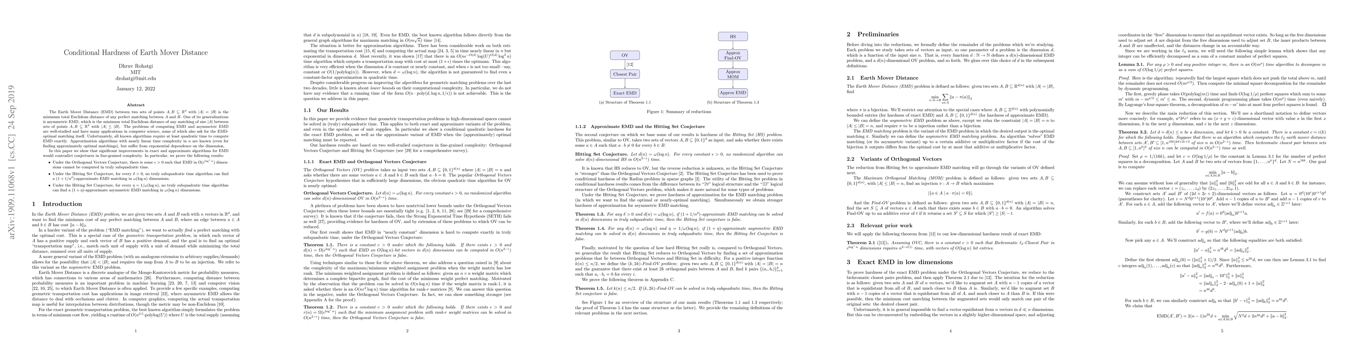 The Earth Mover Distance (EMD) between two sets of points $A, B \subseteq \mathbb{R}^d$ with $|A| = |B|$ is the minimum total Euclidean distance of any perfect matching between $A$ and $B$. One of its generalizations is asymmetric EMD, which is the minimum total Euclidean distance of any matching of size $|A|$ between sets of points $A,B \subseteq \mathbb{R}^d$ with $|A| \leq |B|$. The problems of computing EMD and asymmetric EMD are well-studied and have many applications in computer science, some of which also ask for the EMD-optimal matching itself. Unfortunately, all known algorithms require at least quadratic time to compute EMD exactly. Approximation algorithms with nearly linear time complexity in $n$ are known (even for finding approximately optimal matchings), but suffer from exponential dependence on the dimension. In this paper we show that significant improvements in exact and approximate algorithms for EMD would contradict conjectures in fine-grained complexity. In particular, we prove the following results: (1) Under the Orthogonal Vectors Conjecture, there is some $c>0$ such that EMD in $\Omega(c^{\log^* n})$ dimensions cannot be computed in truly subquadratic time. (2) Under the Hitting Set Conjecture, for every $\delta>0$, no truly subquadratic time algorithm can find a $(1 + 1/n^\delta)$-approximate EMD matching in $\omega(\log n)$ dimensions. (3) Under the Hitting Set Conjecture, for every $\eta = 1/\omega(\log n)$, no truly subquadratic time algorithm can find a $(1 + \eta)$-approximate asymmetric EMD matching in $\omega(\log n)$ dimensions.