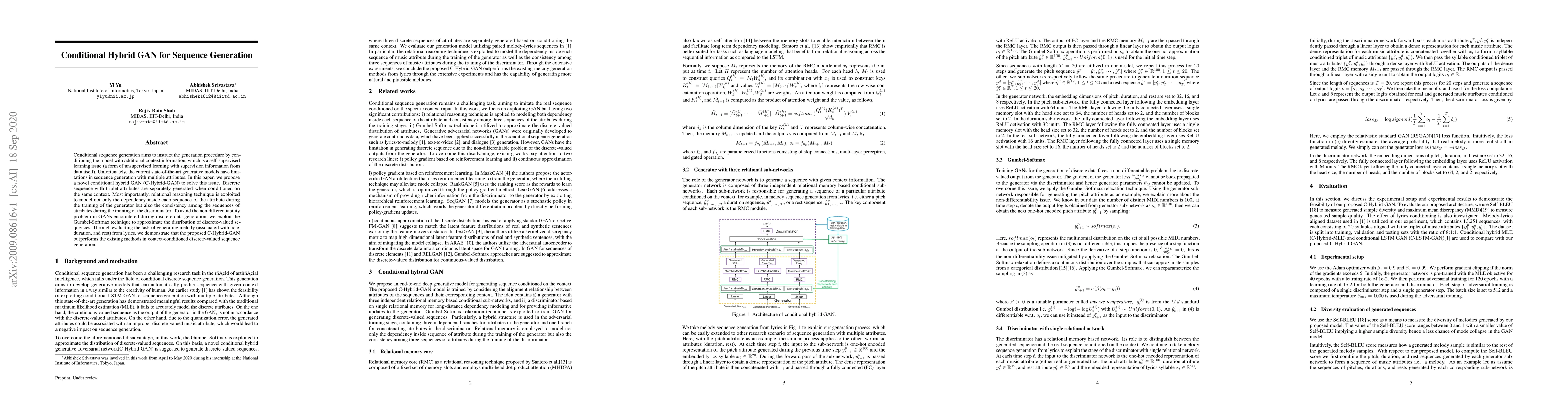 This paper introduces a novel conditional hybrid GAN (C-Hybrid-GAN) for generating sequences conditioned on context information, addressing limitations in existing models for multi-attribute sequence generation. It uses relational reasoning and the Gumbel-Softmax technique to handle discrete sequences and outperforms existing methods in generating melodies from lyrics.