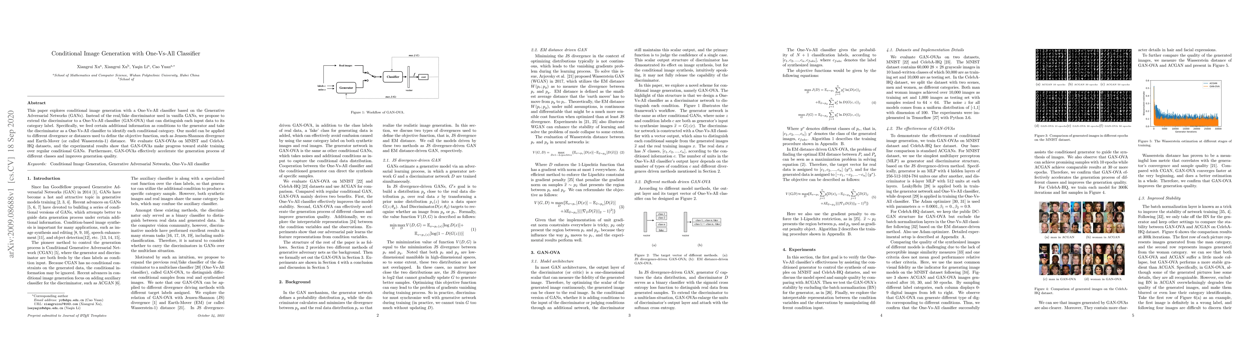 This paper explores conditional image generation with a One-Vs-All classifier based on the Generative Adversarial Networks (GANs). Instead of the real/fake discriminator used in vanilla GANs, we propose to extend the discriminator to a One-Vs-All classifier (GAN-OVA) that can distinguish each input data to its category label. Specifically, we feed certain additional information as conditions to the generator and take the discriminator as a One-Vs-All classifier to identify each conditional category. Our model can be applied to different divergence or distances used to define the objective function, such as Jensen-Shannon divergence and Earth-Mover (or called Wasserstein-1) distance. We evaluate GAN-OVAs on MNIST and CelebA-HQ datasets, and the experimental results show that GAN-OVAs make progress toward stable training over regular conditional GANs. Furthermore, GAN-OVAs effectively accelerate the generation process of different classes and improves generation quality.